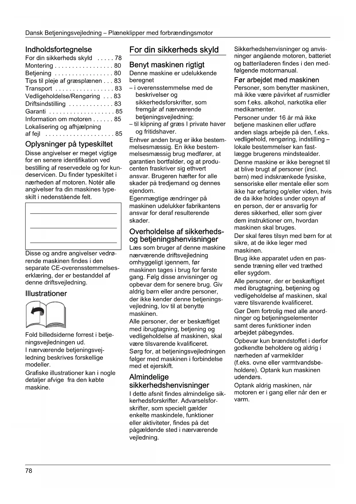 - Lokalisering og afhjælpning af fejl Oplysninger på typeskiltet Disse angivelser er meget vigtige for en senere identifikation ved bestilling af reservedele og for kun- deservicen. Du finder typeskiltet i nærheden af motoren. Notér alle angivelser fra din maskines type- skilt i nedenstående felt. Disse og andre angivelser vedrø- rende maskinen findes i den separate CE-overensstemmelses- erklæring, der er bestanddel af denne driftsvejledning. Illustrationer Fold billedsiderne forrest i betje- ningsvejledningen ud. I nærværende betjeningsvej- ledning beskrives forskellige modeller. Grafiske illustrationer kan i nogle detaljer afvige fra den købte maskine. For din sikkerheds skyld Benyt maskinen rigtigt Denne maskine er udelukkende beregnet – i overensstemmelse med de beskrivelser og sikkerhedsforskrifter, som fremgår af nærværende betjeningsvejledning; – til klipning af græs I private haver og fritidshaver. Enhver anden brug er ikke bestem- melsesmæssig. En ikke bestem- melsesmæssig brug medfører, at garantien bortfalder, og at produ- centen fraskriver sig ethvert ansvar. Brugeren hæfter for alle skader på tredjemand og dennes ejendom. Egenmægtige ændringer på maskinen udelukker fabrikantens ansvar for deraf resulterende skader. Overholdelse af sikkerheds- og betjeningshenvisninger Læs som bruger af denne maskine nærværende driftsvejledning omhyggeligt igennem, før maskinen tages i brug for første gang. Følg disse anvisninger og opbevar dem for senere brug. Giv aldrig børn eller andre personer, der ikke kender denne betjenings- vejledning, lov til at benytte maskinen. Alle personer, der er beskæftiget med ibrugtagning, betjening og vedligeholdelse af maskinen, skal være tilsvarende kvalificeret. Sørg for, at betjeningsvejledningen følger med maskinen i forbindelse med et ejerskift. Almindelige sikkerhedshenvisninger I dette afsnit findes almindelige sik- kerhedsforskrifter. Advarselsfor- skrifter, som specielt gælder enkelte maskindele, funktioner eller aktiviteter, findes på det pågældende sted i nærværende vejledning. Sikkerhedshenvisninger og anvis- ninger angående motoren, batteriet og batteriladeren findes i den med- følgende motormanual. Før arbejdet med maskinen Personer, som benytter maskinen, må ikke være påvirket af rusmidler som f.eks. alkohol, narkotika eller medikamenter. Personer under 16 år må ikke betjene maskinen eller udføre anden slags arbejde på den, f.eks. vedligehold, rengøring, indstilling – lokale bestemmelser kan fast- lægge brugerens mindstealder. Denne maskine er ikke beregnet til at blive brugt af personer (incl. børn) med indskrænkede fysiske, sensoriske eller mentale eller som ikke har erfaring og/eller viden, hvis de da ikke holdes under opsyn af en person, der er ansvarlig for deres sikkerhed, eller som giver dem instruktioner om, hvordan maskinen skal bruges. Der skal føres tilsyn med børn for at sikre, at de ikke leger med maskinen. Brug ikke apparatet uden en pas- sende træning eller ved træthed eller sygdom. Alle personer, der er beskæftiget med ibrugtagning, betjening og vedligeholdelse af maskinen, skal være tilsvarende kvalificeret. Gør Dem fortrolig med alle anord- ninger og betjeningselementer samt deres funktioner inden arbejdet påbegyndes. Opbevar kun brændstoffet i derfor godkendte beholdere og aldrig i nærheden af varmekilder (f.eks. ovne eller varmtvandsbe- holdere). Optank kun maskinen udendørs. Optank aldrig maskinen, når motoren er i gang eller når den er varm.Betjeningsvejledning – Plæneklipper med forbrændingsmotor Dansk p. 85