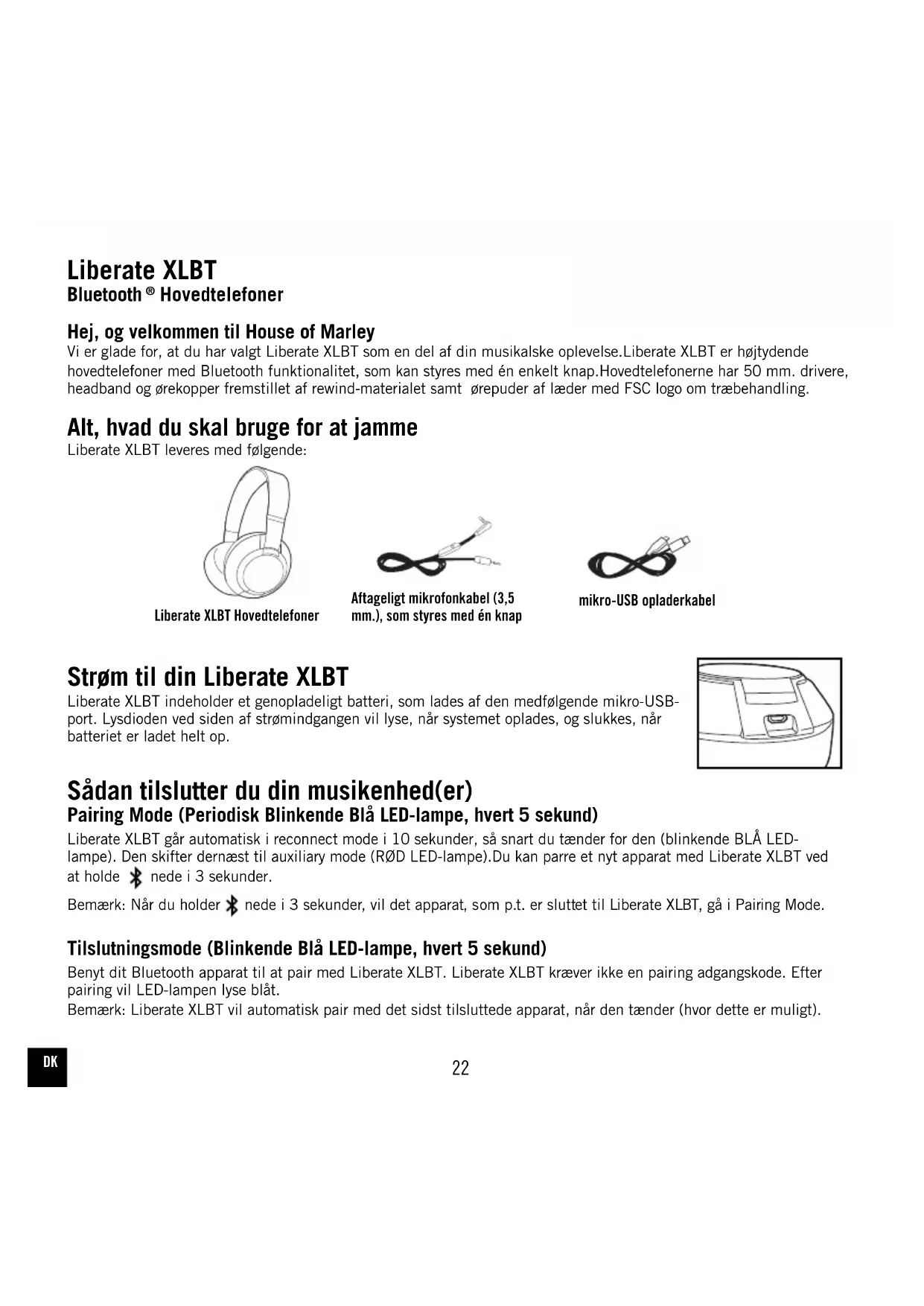 Hovedtelefoner Hej, og velkommen til House of Marley Vi er glade for, at du har valgt Liberate XLBT som en del af din musikalske oplevelse.Liberate XLBT er højtydende hovedtelefoner med Bluetooth funktionalitet, som kan styres med én enkelt knap.Hovedtelefonerne har 50 mm. drivere, headband og ørekopper fremstillet af rewind-materialet samt ørepuder af læder med FSC logo om træbehandling. Alt, hvad du skal bruge for at jamme Liberate XLBT leveres med følgende: Liberate XLBT Hovedtelefoner Aftageligt mikrofonkabel (3,5 mm.), som styres med én knap mikro-USB opladerkabel Strøm til din Liberate XLBT Liberate XLBT indeholder et genopladeligt batteri, som lades af den medfølgende mikro-USB- port. Lysdioden ved siden af strømindgangen vil lyse, når systemet oplades, og slukkes, når batteriet er ladet helt op. Sådan tilslutter du din musikenhed(er) Pairing Mode (Periodisk Blinkende Blå LED-lampe, hvert 5 sekund) Liberate XLBT går automatisk i reconnect mode i 10 sekunder, så snart du tænder for den (blinkende BLÅ LED- lampe). Den skifter dernæst til auxiliary mode (RØD LED-lampe).Du kan parre et nyt apparat med Liberate XLBT ved at holde nede i 3 sekunder. Bemærk: Når du holder nede i 3 sekunder, vil det apparat, som p.t. er sluttet til Liberate XLBT, gå i Pairing Mode. Tilslutningsmode (Blinkende Blå LED-lampe, hvert 5 sekund) Benyt dit Bluetooth apparat til at pair med Liberate XLBT. Liberate XLBT kræver ikke en pairing adgangskode. Efter pairing vil LED-lampen lyse blåt. Bemærk: Liberate XLBT vil automatisk pair med det sidst tilsluttede apparat, når den tænder (hvor dette er muligt). DK23 Således Oplades Apparatet En mikro-USB-port er tilgængelig på Liberate XLBT’s højre ørekop til opladning af dine apparater, både når der er tændt og slukket derfor. Benyt det medfølgende kabel til opladning. BEMÆRK: Ikke alle apparater er kompatible med mikro-USB-porten. Udskiftning af Batteri Din Liberate XLBT indeholder et genopladeligt batteri, som er beregnet til at vare hele produktets levetid. Hvis det usandsynlige skulle ske, og du har brug for et nyt batteri, bedes du kontakte Kundeservice, som kan informere dig om udskiftning af batteri, både så længe garantien gælder og senere. Rør for volumenstyring Hold nede for volumen-ramping Rør for BT-tilslutning (til sidste apparat) Hold nede for pairing (eller frakobling og pairing) Rør for at pause nuværende sang Rør for at spille den nuværende sang, som er pauset Rør for at besvare opkald Rør for at afslutte igangværende opkald Hold nede for at tænde ”ON” Tryk for at tjekke batteriniveauet Hold nede for at slukke ”OFF” Rør for at skifte sang Hold nede for at spole fremad/tilbage24 Mikrofonkompatibilitet og en-knapstyring Med den integrerede mikrofon kan du føre håndfri samtaler. Tryk på knappen for at besvare et opkald. Tryk igen for at afslutte samtalen. Tracking og play/pause funktioner, som er vist på illustrationen, fungerer kun med Apple-apparater. x1 x1