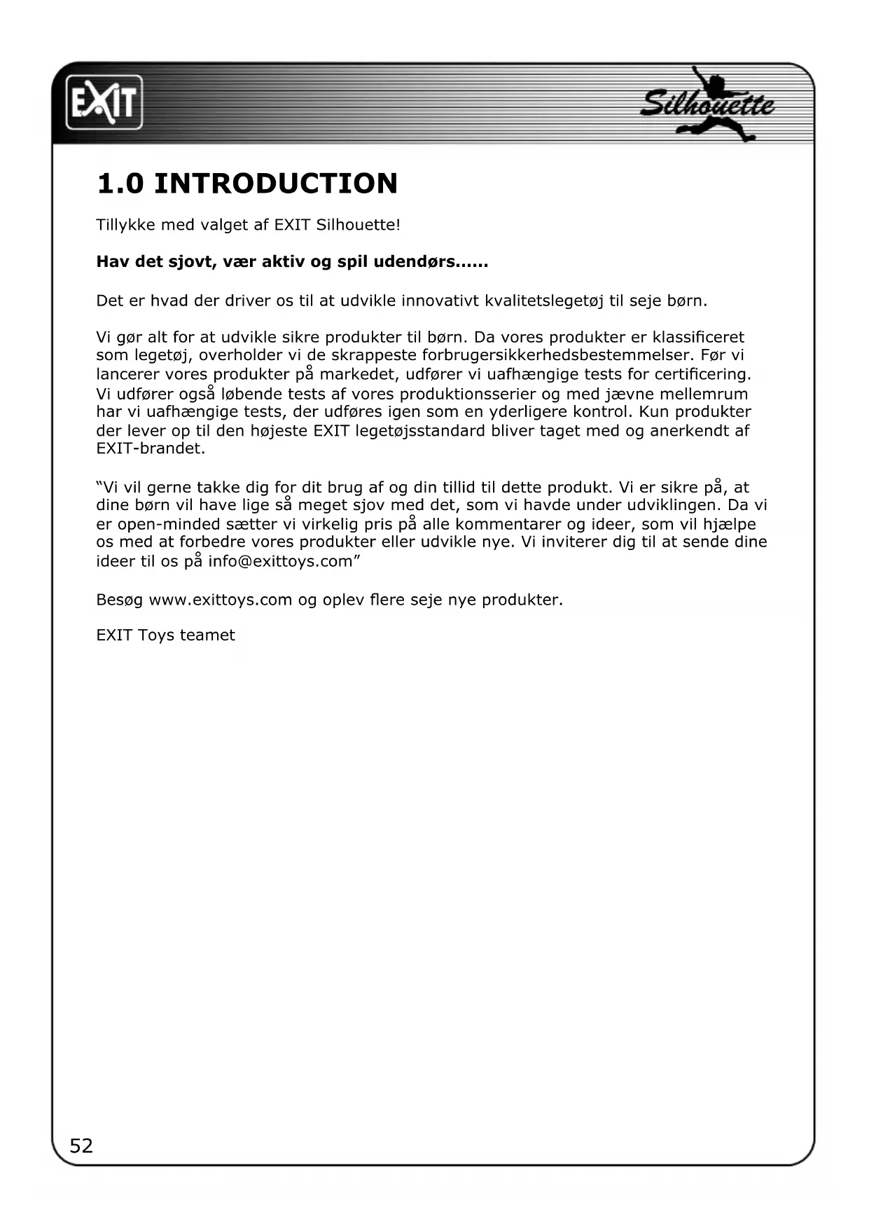 "Vi vil gerne takke dig for dit brug af og din tillid til dette produkt. Vi er sikre på, at dine børn vil have lige så meget sjov med det, som vi havde under udviklingen. Da vi er open-minded sætter vi virkelig pris på alle kommentarer og ideer, som vil hjælpe os med at forbedre vores produkter eller udvikle nye. Vi inviterer dig til at sende dine ideer til os på info@exittoys.com"