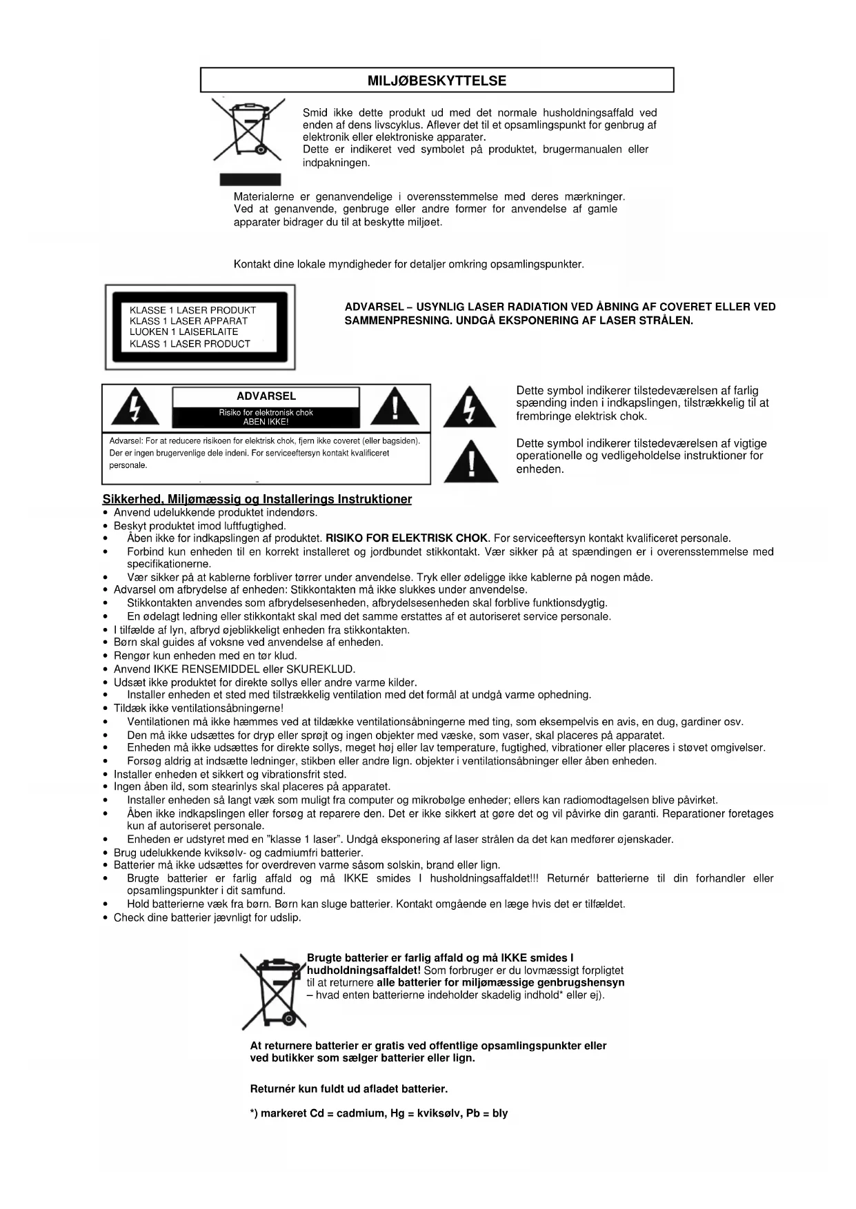- Brugte batterier er farlig affald og ma IKKE smides I husholdningsaffaldet!!! Returner batterierne til din forhandler ell opsamlingspunkter i dit samfund.