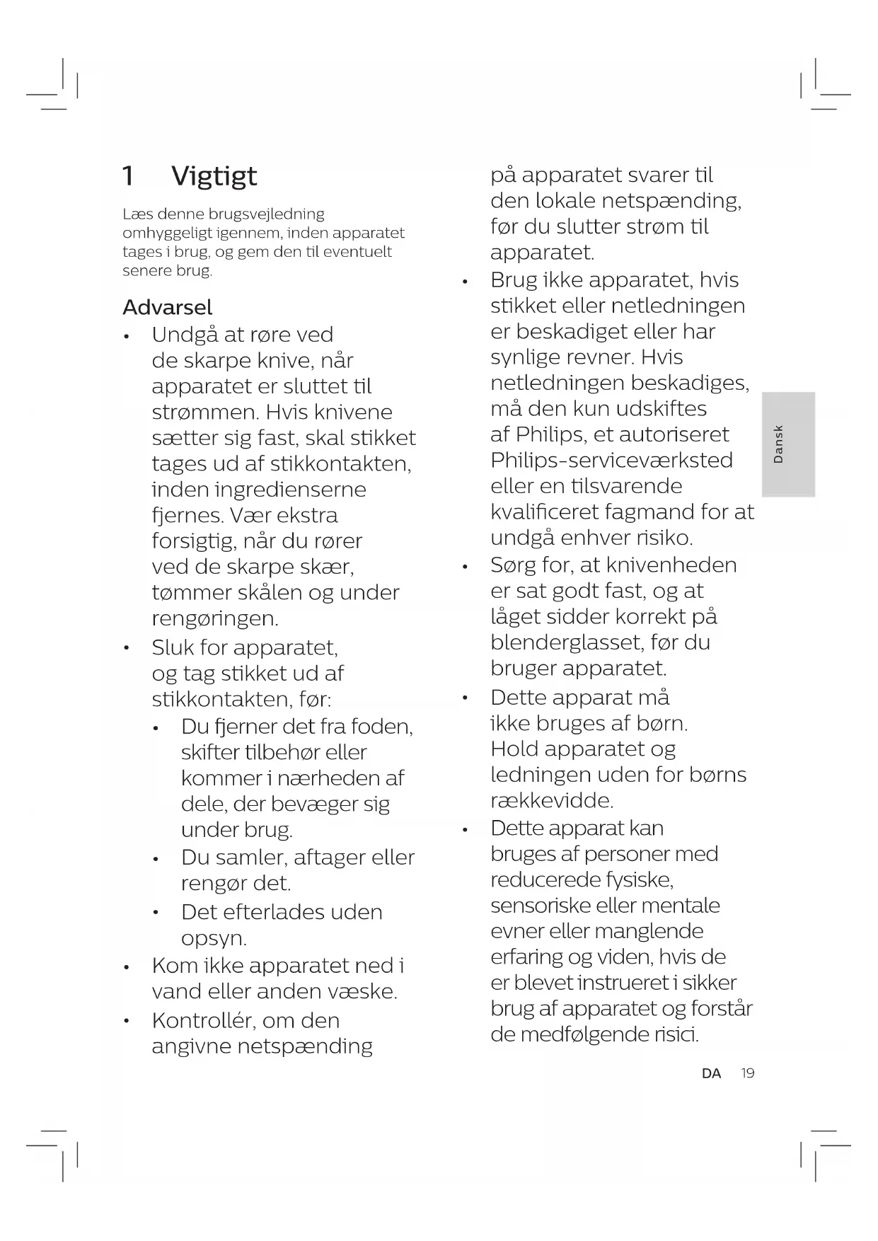 Brug ikke apparatet, hvis stikket eller netledningen er beskadiget eller har synlige revner. Hvis netledningen beskadiges, må den kun udskiftes af Philips, et autoriseret Philips-serviceværksted eller en tilsvarende kvaliceret fagmand for at undgå enhver risiko.