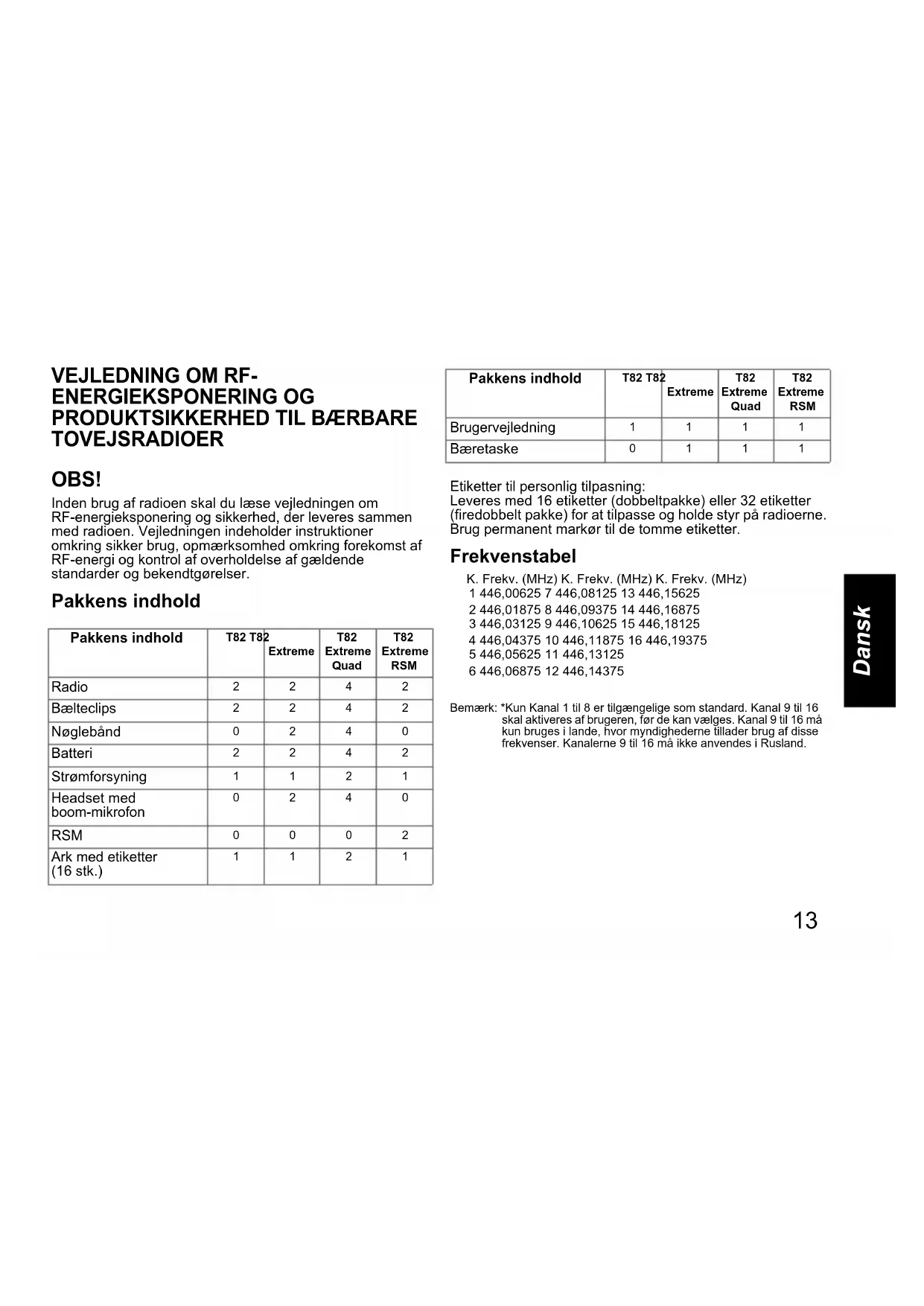 TOVEJSRADIOER OBS! Inden brug af radioen skal du læse vejledningen om RF-energieksponering og sikkerhed, der leveres sammen med radioen. Vejledningen indeholder instruktioner omkring sikker brug, opmærksomhed omkring forekomst af RF-energi og kontrol af overholdelse af gældende standarder og bekendtgørelser. Pakkens indhold Etiketter til personlig tilpasning: Leveres med 16 etiketter (dobbeltpakke) eller 32 etiketter (firedobbelt pakke) for at tilpasse og holde styr på radioerne. Brug permanent markør til de tomme etiketter. Frekvenstabel Bemærk: *Kun Kanal 1 til 8 er tilgængelige som standard. Kanal 9 til 16 skal aktiveres af brugeren, før de kan vælges. Kanal 9 til 16 må kun bruges i lande, hvor myndighederne tillader brug af disse frekvenser. Kanalerne 9 til 16 må ikke anvendes i Rusland. Pakkens indhold T82 T82 Extreme T82 Extreme Quad T82 Extreme RSM Radio