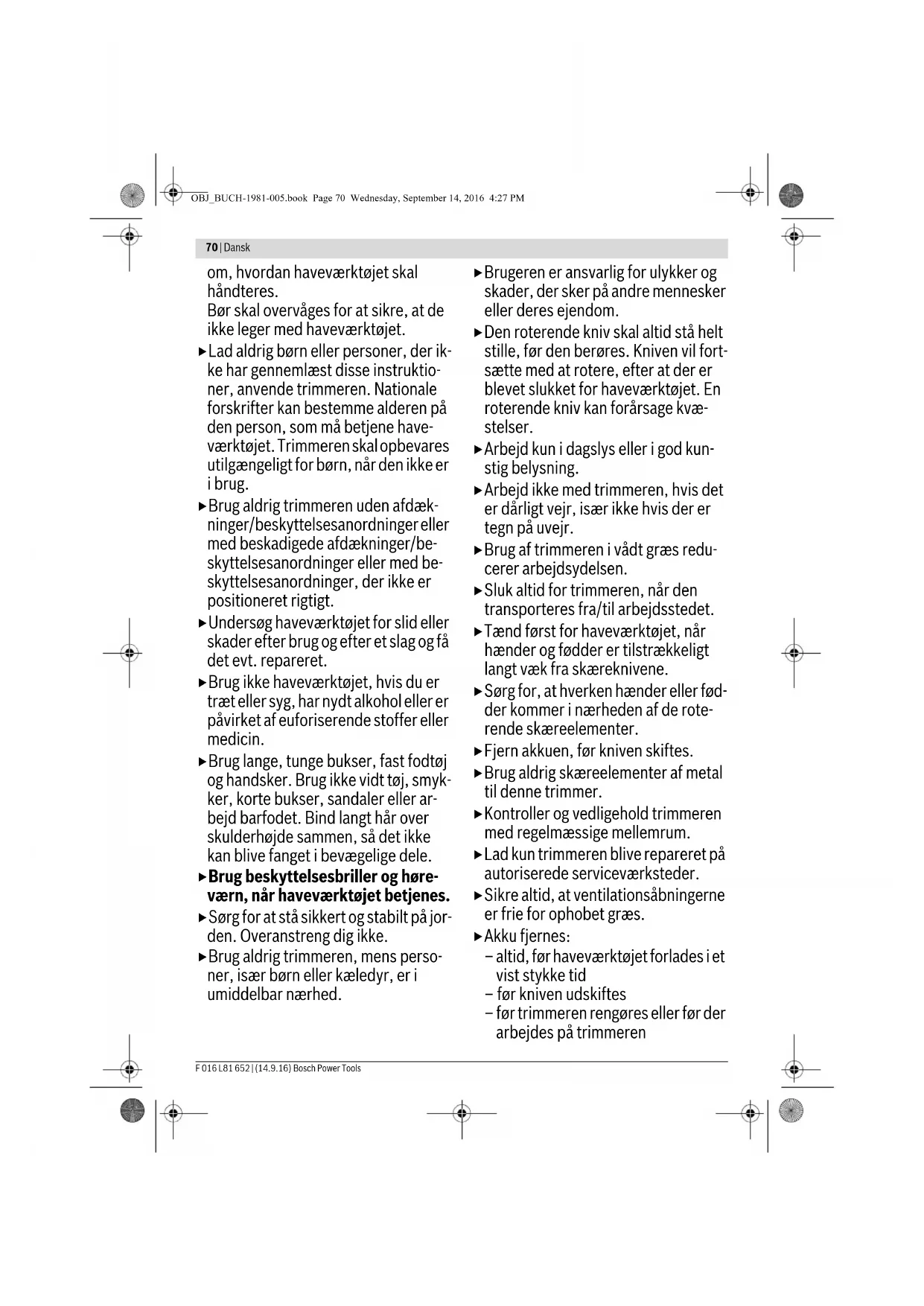 OBJ_BUCH-1981-005.book Page 67 Wednesday, September 14, 2016 4:27 PM68 | Nederlands F 016 L81 652 | (14.9.16) Bosch Power Tools Knipperende rode accuoplaadindicatie Het knipperlicht van de rode accuoplaadindica- tie signaleert een andere storing van het opla- den, zie gedeelte „Storingen opsporen”. Aanwijzingen voor het opladen Bij langdurig opladen of meermaals opladen zonder onder- breking kan het oplaadapparaat warm worden. Dit is echter zonder bezwaar en wijst niet op een technisch defect van het oplaadapparaat. Een duidelijk kortere gebruiksduur na het opladen duidt erop dat de accu versleten is en moet worden vervangen. Storingen opsporen Klantenservice en gebruiksadviezen www.bosch-garden.com Vermeld bij vragen en bestellingen van vervangingsonderde- len altijd het uit tien cijfers bestaande zaaknummer volgens het typeplaatje van het tuingereedschap. Nederland Tel.: (076) 579 54 54 Fax: (076) 579 54 94 E-mail: gereedschappen@nl.bosch.com België Tel.: (02) 588 0589 Fax: (02) 588 0595 E-mail: outillage.gereedschap@be.bosch.com Vervoer Op de meegeleverde Lithium-Ion-accu’s zijn de eisen voor het vervoer van gevaarlijke stoffen van toepassing. De accu’s kun- nen door de gebruiker zonder verdere voorwaarden over de weg worden vervoerd. d.c. Symptomen Mogelijke oorzaak Oplossing Beschermkap kan niet over de snijschijf worden getrokken Verkeerde montage Snijschijf verwijderen en beschermkap opnieuw monteren Gazontrimmer loopt niet Accu leeg Accu opladen, zie ook de „Aanwijzingen voor het opladen” Accu te koud of te heet Accu laten opwarmen of afkoelen Gazontrimmer loopt met onderbrekin- gen Interne bekabeling van tuingereedschap defect Neem contact op met klantenservice Aan/uit-schakelaar defect Neem contact op met klantenservice Tuingereedschap overbelast Gras te hoog Knip het gras in stappen Tuingereedschap snijdt niet Mes beschadigd Mes vervangen Versterkte trillingen Mes beschadigd Mes vervangen Accuoplaadindicatie brandt permanent Geen opladen mogelijk Accu niet (goed) aangebracht Plaats de accu correct op het oplaadap- paraat Accucontacten vuil Reinig de accucontacten, bijvoorbeeld door de accu enkele keren te plaatsen en te verwijderen, of vervang de accu in- dien nodig Accu defect Vervang de accu Accuoplaadindicatie brandt niet Netsnoer van het oplaadapparaat is niet (of niet goed) vastgestoken Steek de stekker (volledig) in het stop- contact Stopcontact, netsnoer of oplaadappa- raat defect Netspanning controleren, oplaadappa- raat indien nodig door een erkende klantenservice voor Bosch elektrische gereedschappen laten controleren OBJ_BUCH-1981-005.book Page 68 Wednesday, September 14, 2016 4:27 PMDansk | 69 Bosch Power Tools F 016 L81 652 | (14.9.16) Bij de verzending door derden (bijv. luchtvervoer of expedi- tiebedrijf) moeten bijzondere eisen ten aanzien van verpak- king en markering in acht worden genomen. In deze gevallen moet bij de voorbereiding van de verzending een deskundige voor gevaarlijke goederen worden geraadpleegd. Verzend accu’s alleen als de behuizing onbeschadigd is. Plak blootliggende contacten af en verpak de accu zodanig dat de- ze niet in de verpakking beweegt. Neem ook eventuele overige nationale voorschriften in acht. Afvalverwijdering Gooi tuingereedschappen, oplaadapparaten, accu’s en batte- rijen niet bij het huisvuil. Alleen voor landen van de EU: Volgens de Europese richtlijn 2012/19/EU moeten niet meer bruikbare elektrische en elektronische apparaten en volgens de Euro- pese richtlijn 2006/66/EG moeten defecte of lege accu’s en batterijen apart worden in- gezameld en op een voor het milieu verant- woorde wijze worden hergebruikt. Accu’s en batterijen: Li-ion: Lees de aanwijzingen in het gedeelte „Ver- voer” en neem deze in acht. Wijzigingen voorbehouden. Dansk Sikkerhedsinstrukser Pas på! Læs efterfølgende instrukser omhyggeligt. Gør dig fortrolig med haveværktøjets betjeningsanordnin- ger og korrekte anvendelse. Opbe- var betjeningsvejledningen til sene- re brug. Forklaring af billedsymbolerne Generel sikkerhedsadvarsel. Læs brugsanvisningen. Pas på udkastede eller flyvende genstande, der kan kvæste til- skuere. Advarsel: Hold god afstand til haveværktøjet, når det arbej- der. Gælder ikke. Tag akkuen ud, før haveværktø- jet indstilles eller rengøres eller stilles fra et sted, hvor det er uden opsyn i et vist stykke tid. Brug høreværn og beskyttelses- briller. Brug ikke trimmeren i regnvejr og lad ikke trimmeren blive stå- ende ude i det fri, når det reg- ner. Pas på udkastede eller flyvende gen- stande, der kan kvæste tilskuere. Advarsel: Hold god afstand til have- værktøjet, når det arbejder. Betjening Dette haveværktøj er ikke egnet til at blive brugt af personer (inkl. børn) med begrænsede fysiske, sensoriske eller psykiske evner eller manglende erfaring og/eller manglende viden, medmindre de overvåges af en sik- kerhedsansvarlig person eller modta- ger instruktioner fra denne person a.c. d.c. OBJ_BUCH-1981-005.book Page 69 Wednesday, September 14, 2016 4:27 PM70 | Dansk F 016 L81 652 | (14.9.16) Bosch Power Tools om, hvordan haveværktøjet skal håndteres. Bør skal overvåges for at sikre, at de ikke leger med haveværktøjet. Lad aldrig børn eller personer, der ik- ke har gennemlæst disse instruktio- ner, anvende trimmeren. Nationale forskrifter kan bestemme alderen på den person, som må betjene have- værktøjet. Trimmeren skal opbevares utilgængeligt for børn, når den ikke er i brug. Brug aldrig trimmeren uden afdæk- ninger/beskyttelsesanordninger eller med beskadigede afdækninger/be- skyttelsesanordninger eller med be- skyttelsesanordninger, der ikke er positioneret rigtigt. Undersøg haveværktøjet for slid eller skader efter brug og efter et slag og få det evt. repareret. Brug ikke haveværktøjet, hvis du er træt eller syg, har nydt alkohol eller er påvirket af euforiserende stoffer eller medicin. Brug lange, tunge bukser, fast fodtøj og handsker. Brug ikke vidt tø