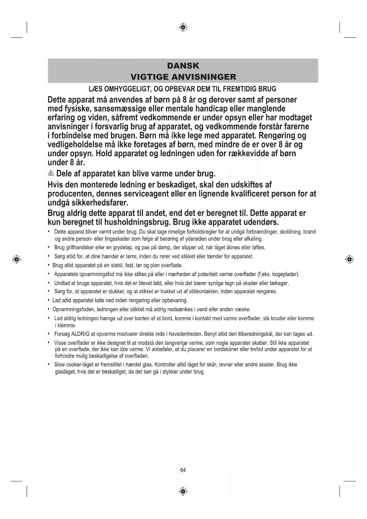 - Apparatet ikke er blevet ændret på nogen måde eller udsat for beskadigelse, forkert brug, misbrug, reparation eller ændring af en person, der ikke er autoriseret af JCS (Europe). Fejl, der sker på grund af forkert brug, beskadigelse, misbrug, brug med forkert spænding, force majeure, hændelser, som JCS (Europe) ikke har indflydelse på, reparation eller ændring af en person, der ikke er autoriseret af JCS (Europe), eller manglende overholdelse af brugsanvisningen, er ikke dækket af denne garanti. Desuden er normal slitage, herunder, men ikke begrænset til, mindre misfarvning og skrammer, ikke dækket af denne garanti. Rettighederne under denne garanti skal kun gælde for den oprindelige køber og skal ikke udvides til kommerciel eller kollektiv brug. Hvis der med dit apparat fulgte en landespecifik erklæring eller garanti, gælder de vilkår og betingelser, der er angivet i det pågældende dokument forud for bestemmelserne i nærværende garanti. I modsat fald bedes du kontakte din lokale autoriserede forhandler for at få flere oplysninger. Brugte elektriske produkter må ikke bortskaffes sammen med husholdningsaffaldet. Benyt venligst en genbrugsordning, hvis en sådan findes. Send en e-mail til os på enquiriesEurope@jardencs.com for at få yderligere oplysninger om genbrug og WEEE. Jarden Consumer Solutions (Europe) Limited 5400 Lakeside Cheadle Royal Business Park Cheadle SK8 3GQ United Kingdom71 NORSK VIKTIGE BESKYTTELSESTILTAK LES NØYE OG OPPBEVAR FOR FRAMTIDIG REFERANSE Dette produktet kan brukes av barn fra 8 år og oppover og personer med reduserte fysiske, sensoriske eller mentale evner eller manglende erfaring og kunnskap hvis de er under tilsyn eller er gitt instruksjoner om bruk på en trygg måte og forstår farene involvert. Barn skal ikke leke med produktet. Rengjøring og vedlikehold må ikke foretas av barn som er under 8 år eller uten tilsyn. Hold produktet og ledningen utenfor rekkevidden til barn under 8 år. Deler av utstyret vil bli varmt under bruk. Hvis strømledningen er skadet, må den erstattes av produsenten, en servicetekniker eller lignende kvalifisert person for å unngå skade. Bruk aldri dette apparatet til noe annet enn tiltenkt bruk. Dette apparatet er kun for husholdningsbruk. Ikke bruk apparatet utendørs.