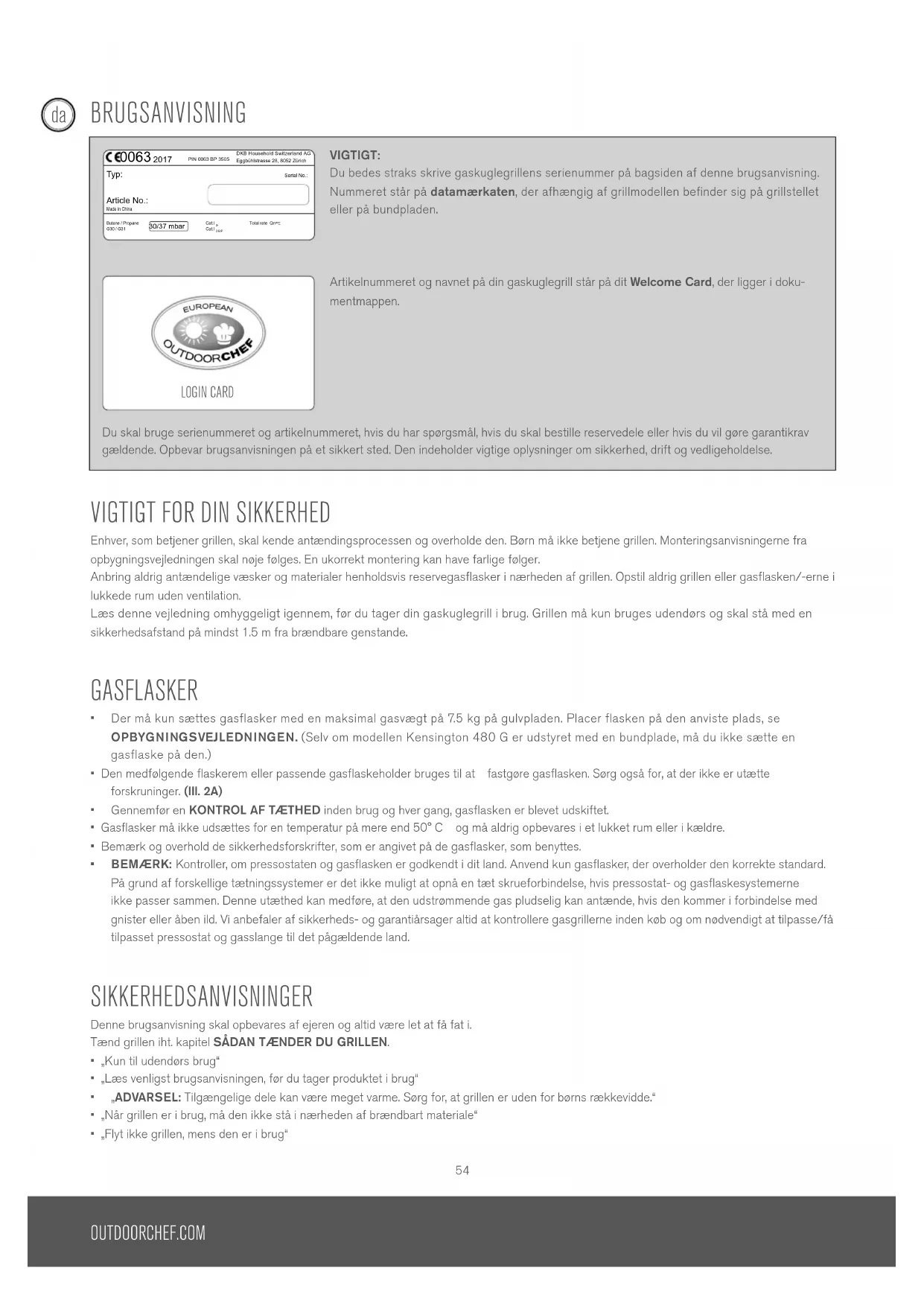 BRUGSANVISNING 54 Læs denne vejledning omhyggeligt igennem, før du tager din OUTDOORCHEF gaskuglegrill i brug.