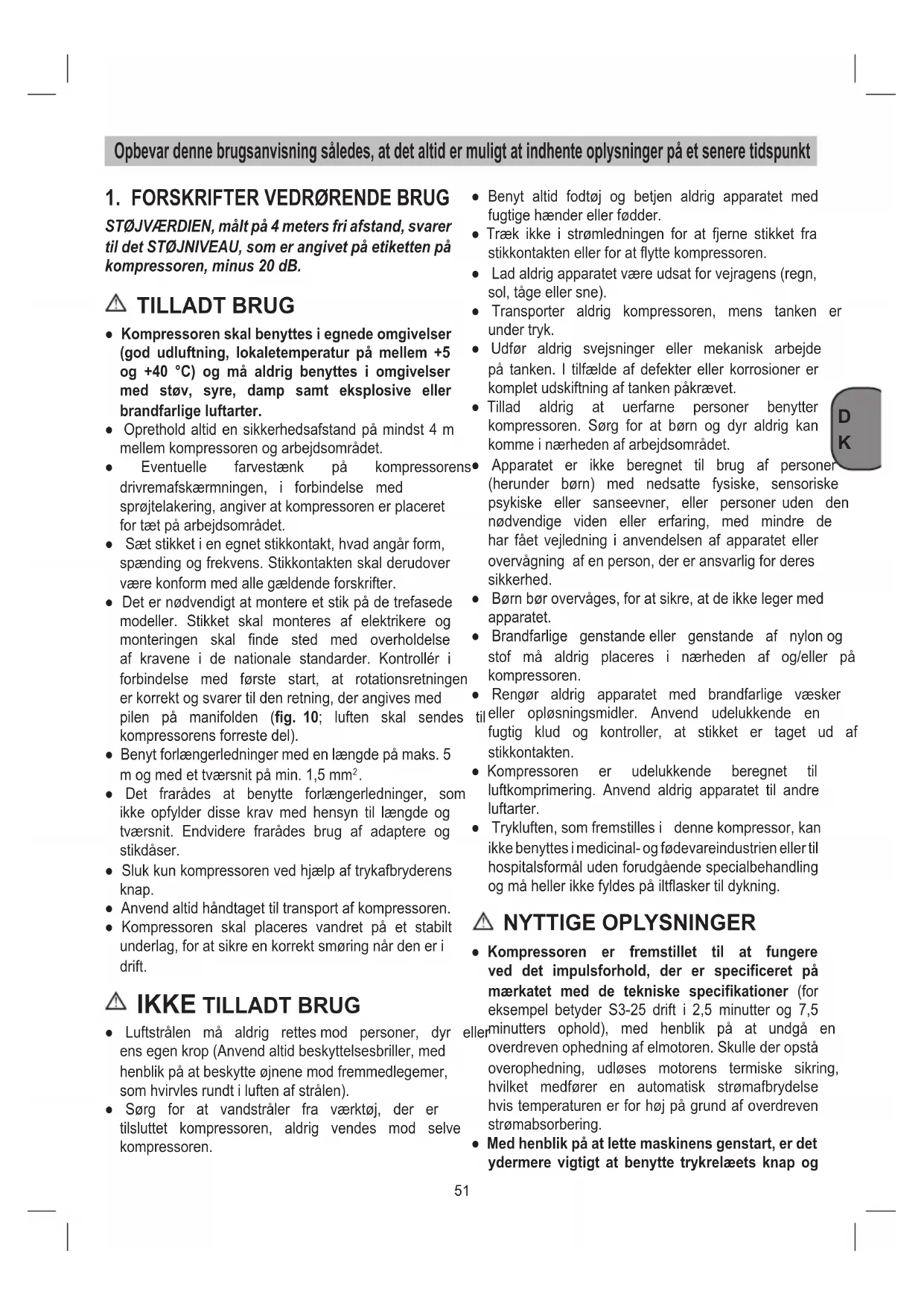 - Kompressoren mä kun anwendes i fertil egnede rum (godt ventilerede, ompivende temperatur +5^- +40^) . Der mä ikke vare stov, syrer, dampe, eksplosie eller brændbare gasser i rummet.