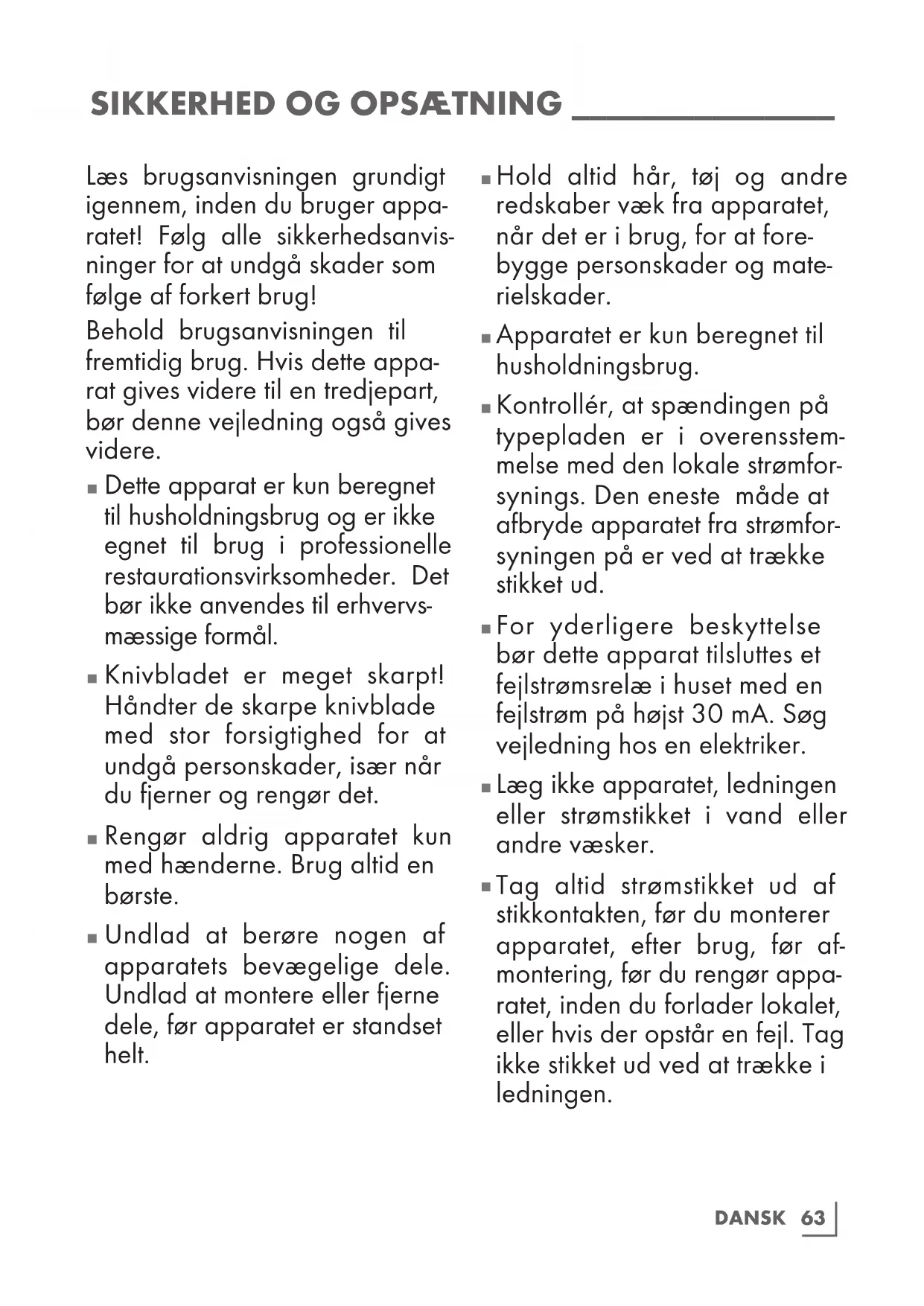 Tag altid strømstikket ud af stikkontakten, før du monterer apparatet, efter brug, før af- montering, før du rengør appa- ratet, inden du forlader lokalet, eller hvis der opstår en fejl. Tag ikke stikket ud ved at trække i ledningen.64 DANSK