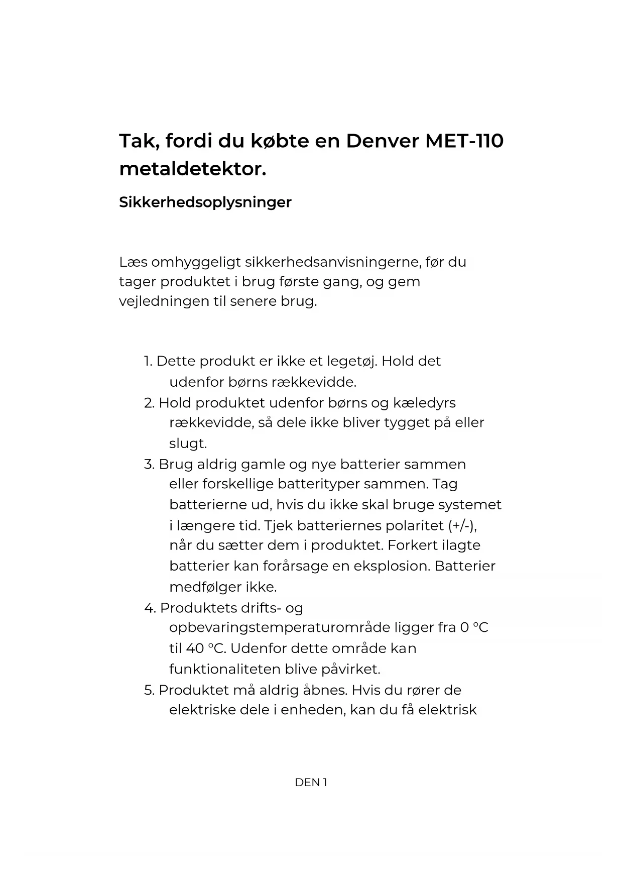enver A/S Omega 5A, Soeften DK-8382 Hinnerup Dänemark www.facebook.com/denver.euDEN 1 Tak, fordi du købte en Denver MET-110 metaldetektor. Sikkerhedsoplysninger Læs omhyggeligt sikkerhedsanvisningerne, før du tager produktet i brug første gang, og gem vejledningen til senere brug.