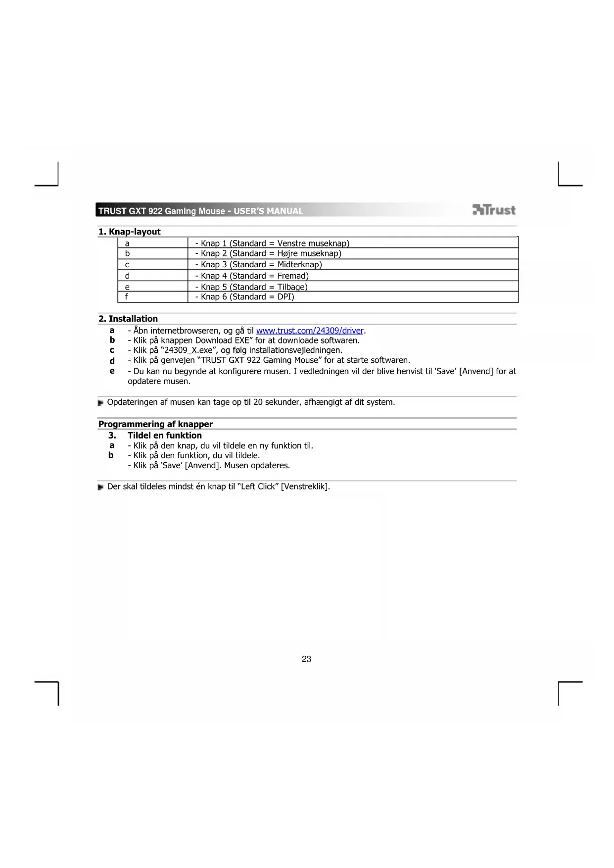 - Åbn internetbrowseren, og gå til www.trust.com/24309/driver. - Klik på knappen Download EXE” for at downloade softwaren. - Klik på “24309_X.exe”, og følg installationsvejledningen. - Klik på genvejen “TRUST GXT 922 Gaming Mouse” for at starte softwaren. - Du kan nu begynde at konfigurere musen. I vedledningen vil der blive henvist til ‘Save’ [Anvend] for at opdatere musen. Opdateringen af musen kan tage op til 20 sekunder, afhængigt af dit system. Programmering af knapper