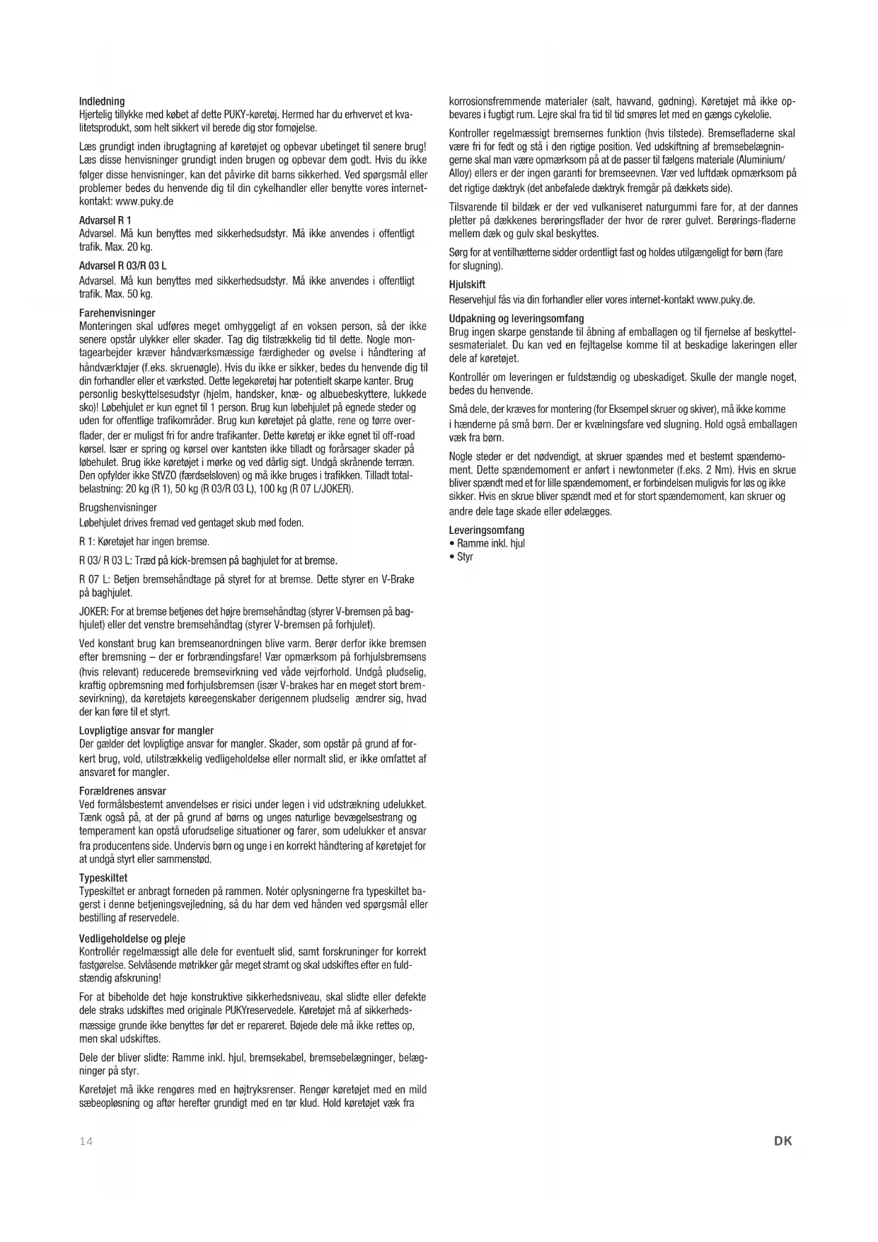 Monteringen skal udfores meget omhyggeligt af en voksen person, sa der ikke senere opstar ulykker er skader. Tag dig tilstrakkelig tid til dette. Nogle montagebearjeber kraver handvarksmaessige ferdigheder og ovelse i handtering af handvarktojer (f.ecks. skruenogle). Hvis du icke er sikker, bedes du henvende dig til din forhandler er et varksted. Dette legekretoj har potentielt skarpe kanter. Brug personlig besykttelsessudstyr (hjelm, handsker, knae- og albuebeskyttere, lukkede sko)! Lbohejulet er kun egnet til 1 person. Brug kun lbohejulet pa egnede steder og eden for offentlige trafikomrader. Brug kun koretojet pa glatte, rene og torre overflader, der er muligst fri for andre trafikanter. Dette koretojet er icke egnet til off-road korsel. Isar er spring og korsel over kantsten icke tilladt od forarsager skader pa lboheulet. Brug icke koretojet imorke og ved darelig sitg. Undgsa skranende terraan Den opfyder icke StVZO (faerdelsloven) og ma icke bruges i trafikken. Tilladt totalbelastning: 20kg R 1), 50kg (R 03/R 03 L), 100kg (R 07 L/JOKER).