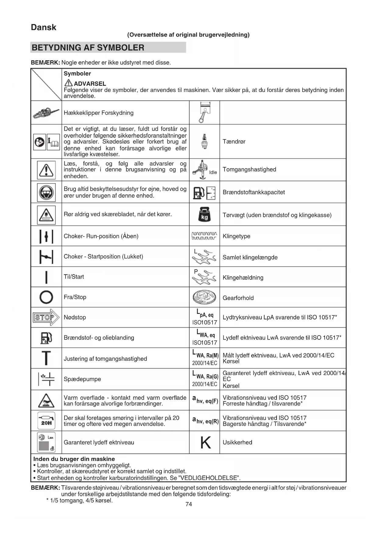 BEMÆRK: Nogle enheder er ikke udstyret med disse. Symboler ADVARSEL Følgende viser de symboler, der anvendes til maskinen. Vær sikker på, at du forstår deres betydning inden anvendelse. Hækkeklipper Forskydning Det er vigtigt, at du læser, fuldt ud forstår og overholder følgende sikkerhedsforanstaltninger og advarsler. Skødesløs eller forkert brug af denne enhed kan forårsage alvorlige eller livsfarlige kvæstelser. Tændrør Læs, forstå, og følg alle advarsler og instruktioner i denne brugsanvisning og på enheden. Idle Tomgangshastighed Brug altid beskyttelsesudstyr for øjne, hoved og ører under brugen af denne enhed. Brændstoftankkapacitet Rør aldrig ved skærebladet, når det kører. Tørvægt (uden brændstof og klingekasse) Choker- Run-position (Åben) Klingetype Choker - Startposition (Lukket)