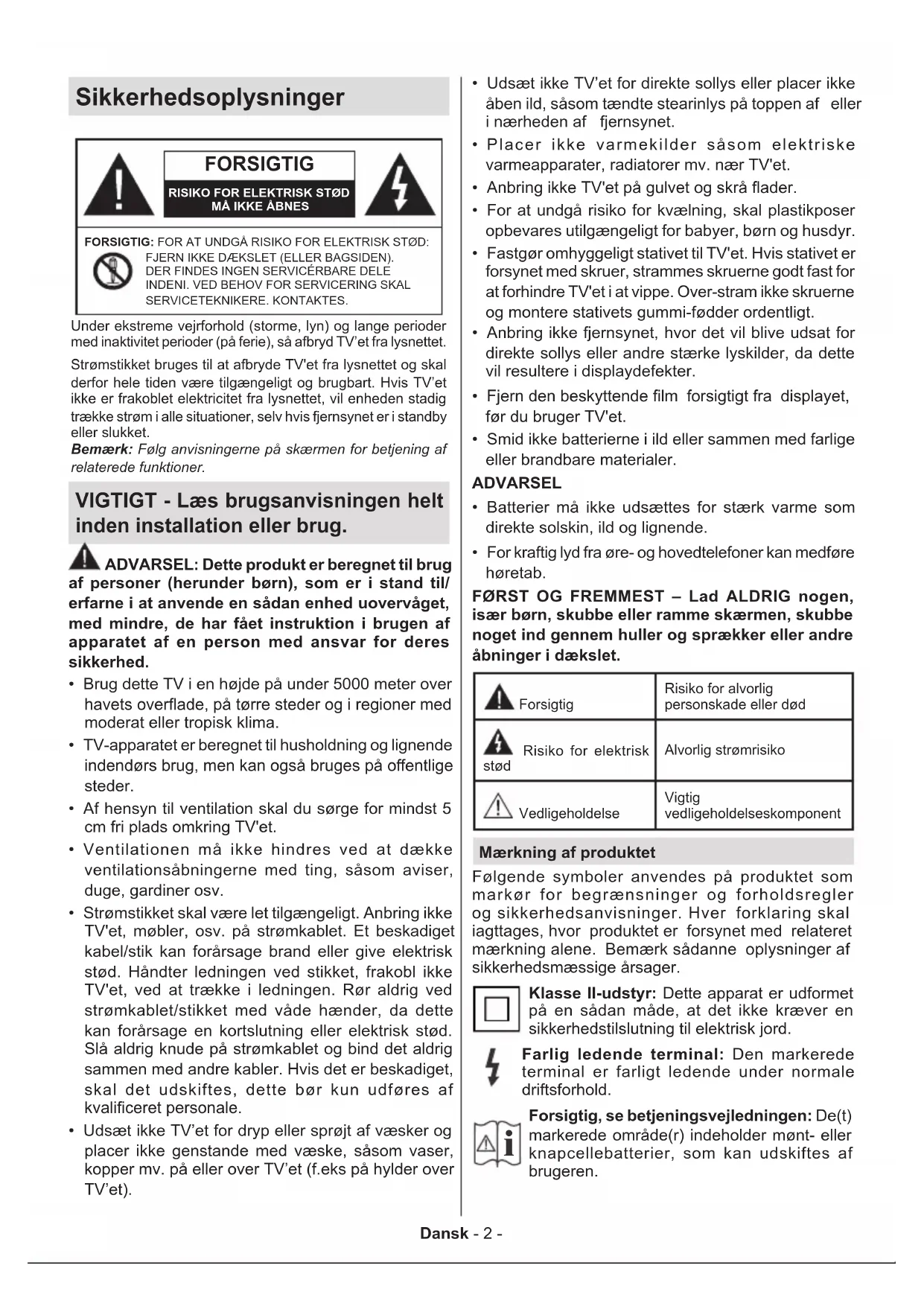 gelige driftsforhold. ADVARSEL Batteriet må ikke sluges. Giver risiko for kemiske ætsningsskader Dette produkt eller tilbehøret, som leveres sammen med produktet, kan indeholde et batteri i knapstørrel- se. Hvis knapcellebatteriet sluges, kan det medføre alvorlige indre ætse-skader på bare 2 timer, hvilket kan være livsfarligt. Opbevar nye og brugte batterier utilgængeligt for børn. Hvis batteridækslet ikke lukker ordentligt, skal du stoppe med at bruge produktet og opbevare det utilgængeligt for børn. Hvis du har mistanke om at batterier kan være blevet slugt eller placeret inde i en del af kroppen, skal du straks søge lægehjælp. – – – – – – – – – – – – Advarsel - Fare for ustabilitet Et TV kan falde ned og forårsage alvorlig personskade eller død. Mange skader, især for børn, kan undgås ved at tage simple forholdsregler, såsom: