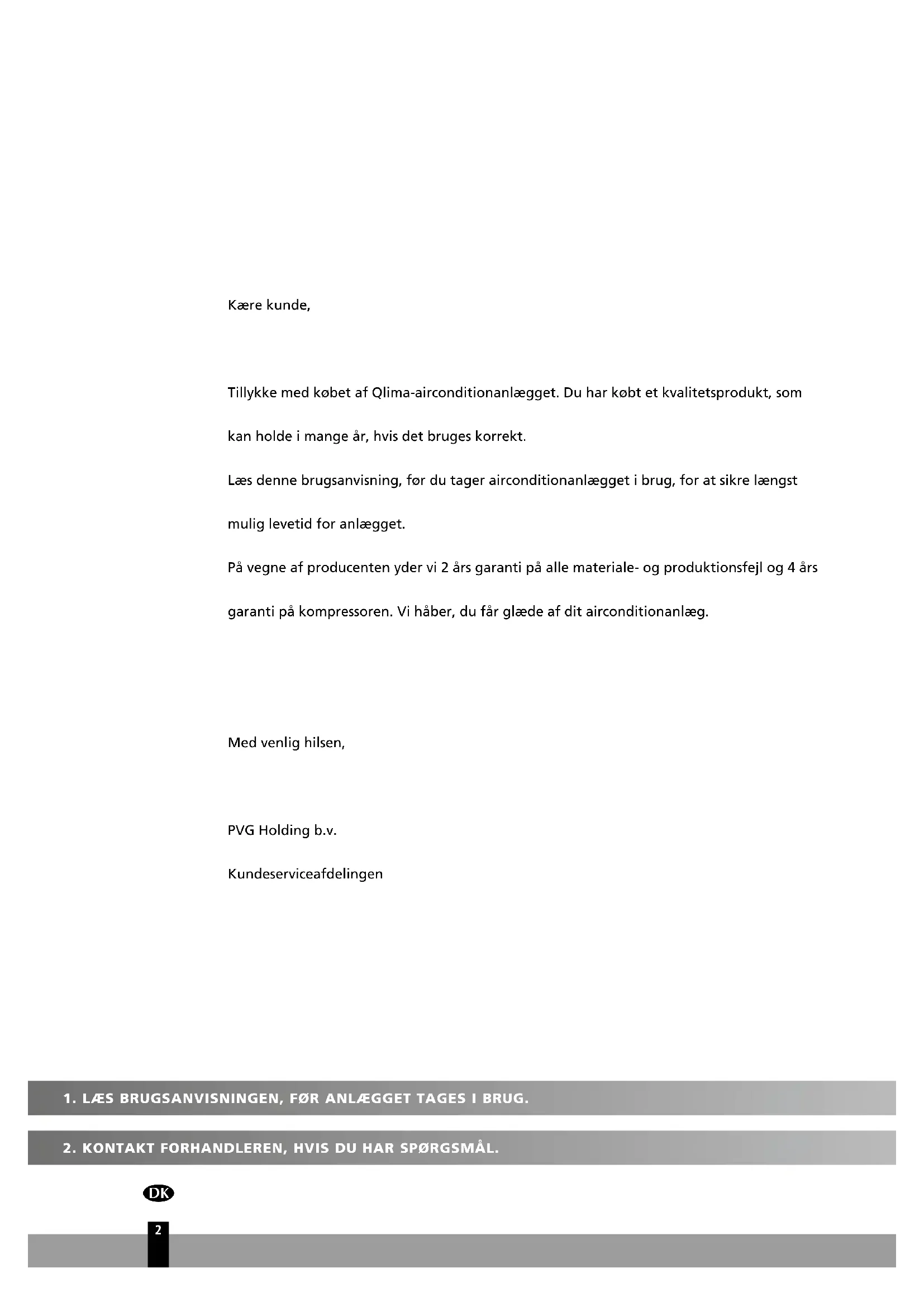Kære kunde, Tillykke med købet af Qlima-airconditionanlægget. Du har købt et kvalitetsprodukt, som kan holde i mange år, hvis det bruges korrekt. Læs denne brugsanvisning, før du tager airconditionanlægget i brug, for at sikre længst mulig levetid for anlægget. På vegne af producenten yder vi 2 års garanti på alle materiale- og produktionsfejl og 4 års garanti på kompressoren. Vi håber, du får glæde af dit airconditionanlæg. Med venlig hilsen, PVG Holding b.v. Kundeserviceafdelingen6