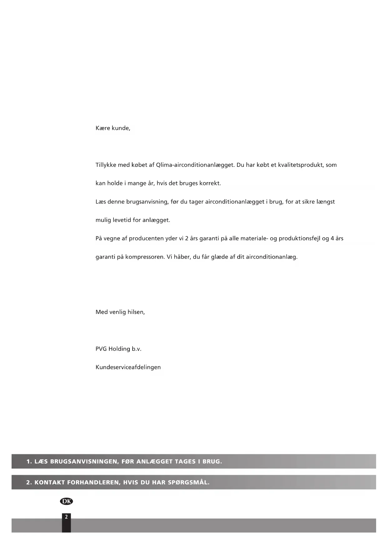 Kære kunde, Tillykke med købet af Qlima-airconditionanlægget. Du har købt et kvalitetsprodukt, som kan holde i mange år, hvis det bruges korrekt. Læs denne brugsanvisning, før du tager airconditionanlægget i brug, for at sikre længst mulig levetid for anlægget. På vegne af producenten yder vi 2 års garanti på alle materiale- og produktionsfejl og 4 års garanti på kompressoren. Vi håber, du får glæde af dit airconditionanlæg. Med venlig hilsen, PVG Holding b.v. Kundeserviceafdelingen6