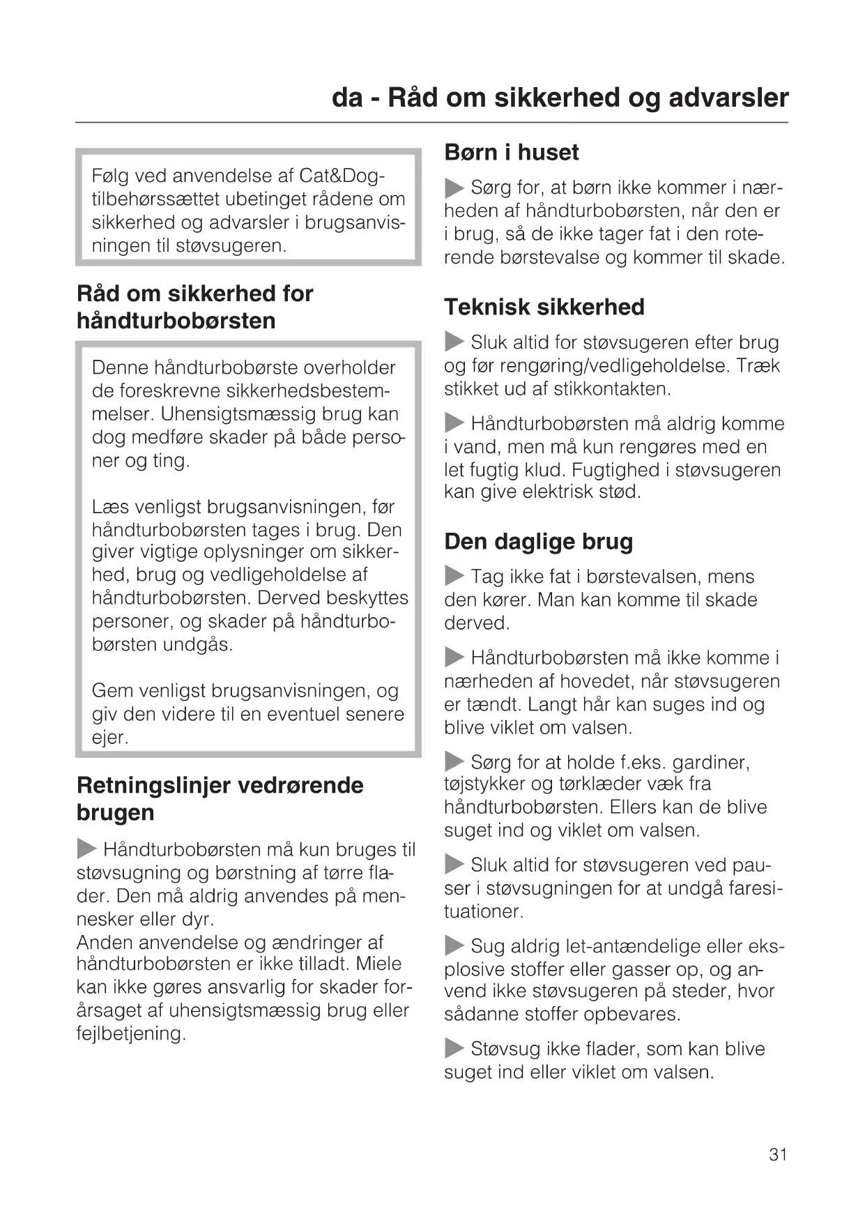 Håndturbobørsten må aldrig komme i vand, men må kun rengøres med en let fugtig klud. Fugtighed i støvsugeren kan give elektrisk stød. Den daglige brug