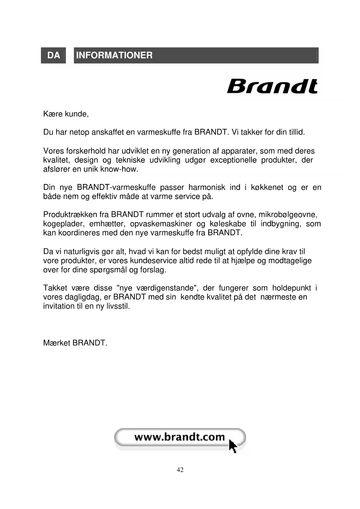 Kære kunde, Du har netop anskaffet en varmeskuffe fra BRANDT. Vi takker for din tillid. Vores forskerhold har udviklet en ny generation af apparater, som med deres kvalitet, design og tekniske udvikling udgør exceptionelle produkter, der afslører en unik know-how. Din nye BRANDT-varmeskuffe passer harmonisk ind i køkkenet og er en både nem og effektiv måde at varme service på. Produktrækken fra BRANDT rummer et stort udvalg af ovne, mikrobølgeovne, kogeplader, emhætter, opvaskemaskiner og køleskabe til indbygning, som kan koordineres med den nye varmeskuffe fra BRANDT. Da vi naturligvis gør alt, hvad vi kan for bedst muligt at opfylde dine krav til vore produkter, er vores kundeservice altid rede til at hjælpe og modtagelige over for dine spørgsmål og forslag. Takket være disse "nye værdigenstande", der fungerer som holdepunkt i vores dagligdag, er BRANDT med sin kendte kvalitet på det nærmeste en invitation til en ny livsstil.