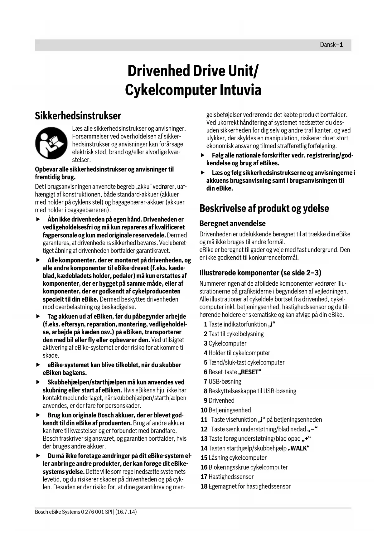 2,5 3,5 Aantal accucellen 30 –40 Bedrijfstemperatuur °C –5...+40 Bewaartemperatuur °C –10...+50 Gewicht volgens EPTA-Procedure 01/2003 kg 0,8 Beschermingsklasse IP 40 De gegevens gelden voor nominale spanningen [U] 230 V. Bij afwijken- de spanningen en bij per land verschillende uitvoeringen kunnen deze gegevens afwijken.Nederlands–15 0 276 001 SPI | (16.7.14) Bosch eBike Systems Opmerking: Als u aan de fiets geladen hebt, sluit dan na de laadbewerking de laadbus C6 zorgvuldig met de afdekking C7 zodat er geen vuil of water kan indringen. Als het oplaadapparaat na het laden niet van de accu geschei- den wordt, dan schakelt het laadapparaat na een paar uur op- nieuw in, controleert het de laadtoestand van de accu en be- gint eveneens opnieuw met de laadbewerking. Oorzaken en oplossingen van fouten Onderhoud en service Onderhoud en reiniging Mocht het oplaadapparaat niet meer werken, neem dan con- tact op met een erkende rijwielhandel. Klantenservice en gebruiksadviezen Neem bij alle vragen over het oplaadapparaat contact op met een erkende rijwielhandel. Contactgegevens van de erkende rijwielhandel vindt u op de internetpagina www.bosch-ebike.com Afvalverwijdering Oplaadapparaten, toebehoren en verpakkingen moeten op een voor het milieu verantwoorde wijze worden hergebruikt. Gooi oplaadapparaten niet bij het huisvuil! Alleen voor landen van de EU: Volgens de Europese richtlijn 2012/19/EU over elektrische en elektronische oude ap- paraten en de omzetting van de richtlijn in nationaal recht moeten niet meer bruikbare oplaadapparaten apart worden ingezameld en op een voor het milieu verantwoorde wij- ze worden hergebruikt. Wijzigingen voorbehouden. Oorzaak Oplossing Twee leds op de accu knipperen. Accu defect Contact opnemen met erken- de rijwielhandel Drie leds op de accu knipperen Accu te warm of te koud Accu van het oplaadapparaat scheiden tot het laadtempe- ratuurbereik bereikt is. Sluit de accu pas weer aan op het oplaadapparaat als deze de toegestane oplaadtempe- ratuur heeft bereikt. Geen opladen mogelijk (geen indicatie op accu) Stekker niet goed ingestoken Alle insteekverbindingen controleren Contacten van accu vuil Contacten van accu voor- zichtig reinigen Stopcontact, kabel of oplaad- apparaat defect Netspanning controleren, oplaadapparaat door rijwiel- handel laten controleren Accu defect Contact opnemen met erkende rijwielhandelDansk–1 Bosch eBike Systems 0 276 001 SPI | (16.7.14) Drivenhed Drive Unit/ Cykelcomputer Intuvia Sikkerhedsinstrukser Læs alle sikkerhedsinstrukser og anvisninger. Forsømmelser ved overholdelsen af sikker- hedsinstrukser og anvisninger kan forårsage elektrisk stød, brand og/eller alvorlige kvæ- stelser. Opbevar alle sikkerhedsinstrukser og anvisninger til fremtidig brug. Det i brugsanvisningen anvendte begreb „akku“ vedrører, uaf- hængigt af konstruktionen, både standard-akkuer (akkuer med holder på cyklens stel) og bagagebærer-akkuer (akkuer med holder i bagagebæreren). Åbn ikke drivenheden på egen hånd. Drivenheden er vedligeholdelsesfri og må kun repareres af kvalificeret fagpersonale og kun med originale reservedele. Dermed garanteres, at drivenhedens sikkerhed bevares. Ved uberet- tiget åbning af drivenheden bortfalder garantikravet. Alle komponenter, der er monteret på drivenheden, og alle andre komponenter til eBike-drevet (f.eks. kæde- blad, kædebladets holder, pedaler) må kun erstattes af komponenter, der er bygget på samme måde, eller af komponenter, der er godkendt af cykelproducenten specielt til din eBike. Dermed beskyttes drivenheden mod overbelastning og beskadigelse. Tag akkuen ud af eBiken, før du påbegynder arbejde (f.eks. eftersyn, reparation, montering, vedligeholdel- se, arbejde på kæden osv.) på eBiken, transporterer den med bil eller fly eller opbevarer den. Ved utilsigtet aktivering af eBike-systemet er der risiko for at komme til skade. eBike-systemet kan blive tilkoblet, når du skubber eBiken baglæns. Skubbehjælpen/starthjælpen må kun anvendes ved skubning eller start af eBiken. Hvis eBikens hjul ikke har kontakt med underlaget, når skubbehjælpen/starthjælpen anvendes, er der fare for personskader. Brug kun originale Bosch akkuer, der er blevet god- kendt til din eBike af produenten. Brug af andre akkuer kan føre til kvæstelser og er forbundet med brandfare. Bosch fraskriver sig ansvaret, og garantien bortfalder, hvis der bruges andre akkuer. Du må ikke foretage ændringer på dit eBike-system el- ler anbringe andre produkter, der kan forøge dit eBike- systems ydelse. Dette ville som regel nedsætte systemets levetid, og du risikerer skader på drivenheden og på cyk- len. Desuden er der risiko for, at dine garantikrav og man- gelsbeføjelser vedrørende det købte produkt bortfalder. Ved ukorrekt håndtering af systemet nedsætter du des- uden sikkerheden for dig selv og andre trafikanter, og ved ulykker, der skyldes en manipulation, risikerer du et stort økonomisk ansvar og tilmed strafferetlig forfølgning. Følg alle nationale forskrifter vedr. registrering/god- kendelse og brug af eBikes. Læs og følg sikkerhedsinstrukserne og anvisningerne i akkuens brugsanvisning samt i brugsanvisningen til din eBike. Beskrivelse af produkt og ydelse Beregnet anvendelse Drivenheden er udelukkende beregnet til at trække din eBike og må ikke bruges til andre formål. eBike er beregnet til gader og veje med fast undergrund. Den er ikke godkendt til konkurrenceformål. Illustrerede komponenter (se side 2–3) Nummereringen af de afbildede komponenter vedrører illu- strationerne på grafiksiderne i begyndelsen af vejledningen. Alle illustrationer af cykeldele bortset fra drivenhed, cykel- computer inkl. betjeningsenhed, hastighedssensor og de til- hørende holdere er skematiske og kan afvige på din eBike. 1 Taste indikatorfunktion „i“ 2 Tast til cykelbelysning 3 Cykelcomputer 4 Holder til cykelcomputer 5 Tænd/sluk-tast cykelcomputer 6 Reset-taste „RESET“ 7 USB-bøsning 8 Bes