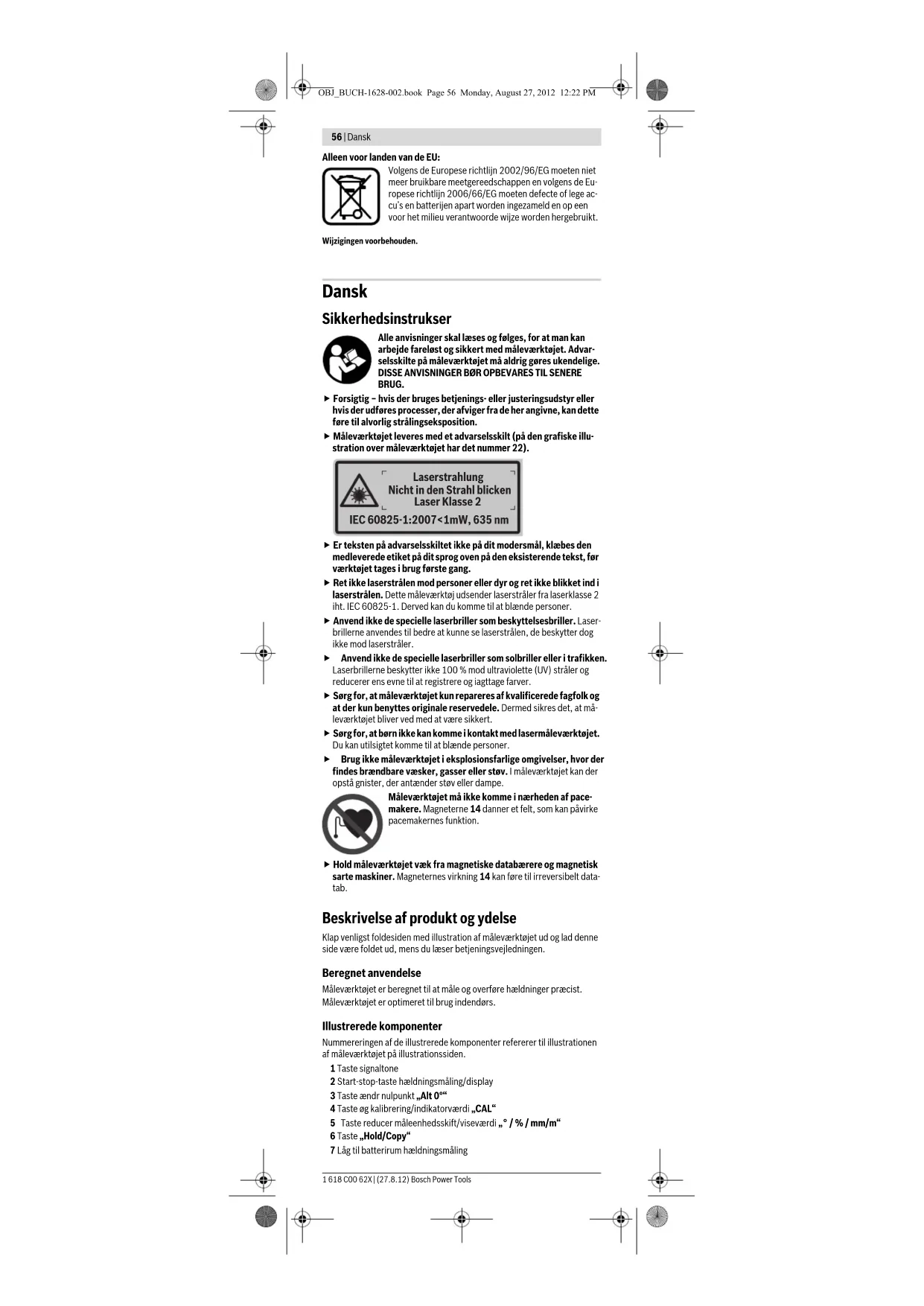 solstråler). Dit måleværktøj identificeres entydigt vha. serienummeret 23 på typeskiltet. OBJ_BUCH-1628-002.book Page 57 Monday, August 27, 2012 12:22 PM58 | Dansk 1 618 C00 62X | (27.8.12) Bosch Power Tools Tilslut batteriet til batteriholderen; sørg for, at polerne vender rigtigt. Sæt låget til batterirummet med batteriholderen ind i måleværktøjet, så tilslut- ningskablerne ikke kommer i klemme. Første gang der tændes for hældningsmålingen efter batteriskiftet lyser alle displayelementer i 1 s, desuden høres en signaltone. Alle gemte indstillin- ger (målefunktion, indstillet måleenhed) slettes, når batteriet skiftes. Lyser batteriadvarslen d, skal batterierne skiftes. Isætning/udskiftning af batterier til laser Skru låget til batterirummet 20 op og sæt batterierne i. Kontroller, at poler- ne vender rigtigt som vist på indersiden af låget til batterirummet. Lyser laseren ikke mere, skal batterierne skiftes. Bemærk: Batteriadvarslen d i displayet gælder ikke for batterierne til laseren. f Sluk ubetinget for laseren, før batterierne skiftes. En utilsigtet tændt laser kan blænde personer. Erstat altid alle batterier, der er beregnet til laserfunktionen, på samme tid. Batterierne skal stamme fra den samme fabrikant og have den samme kapa- citet. Brug Ibrugtagning f Beskyt måleværktøjet mod fugtighed og direkte solstråler. f Udsæt ikke måleværktøjet for ekstreme temperaturer eller tempe- ratursvingninger. Lad det f.eks. ikke ligge i bilen i længere tid. Sørg al- tid for, at måleværtøjet er tempereret ved større temperatursvingninger, før det tages i brug. Ved ekstreme temperaturer eller temperatursving- ninger kan måleværktøjets præcision forringes. f Undgå at udsætte måleværktøjet for voldsomme stød eller fald. Hvis måleværktøjet udsættes for stærke, udvendige påvirkninger, skal du al- tid gennemføre en nøjagtighedskontrol, før der arbejdes videre med det (se „Nøjagtighedskontrol og kalibrering af måleværktøj“, side 60). f Hold måleværktøjets kontaktflader rene og beskyt dem mod stød og slag. Snavspartikler eller deformationer kan føre til fejlmålinger. Opstilling/fastgørelse af måleværktøj Til måling og overførsel af hældninger kan du ikke kun anbringe eller lægge måleværktøjet på flader, du har også andre muligheder for at opstille og fastgøre det. Opstilling med nivelleringsmekanik (f.eks. hvis gulvet/undergrunden er ujævn) (se Fig. B): – Tryk kort mod foden 16, så den kører ud. Tryk på tasten 8 for at køre ni- velleringsfoden ud 17. Juster nivelleringsfoden ved at dreje på juste- ringsskruen 9 i højden, så laserstrålen forløber langs med fladen, der skal måles, hhv. den ønskede hældning vises som måleværdi b. – Til arbejde uden nivelleringsmekanik køres foden 16 og nivelleringsfo- den 17 ind igen. Tryk de to del af foden sammen () og skub så foden 16 ind i måleværktøjet (), til den falder hørbart i hak. Nivelleringsfo- den 17 køres ind ved at skubbe kontakten 10 ud til siden. Fastgørelse på stativet: – Anbring måleværktøjet med 1/4"-stativholder 18 på hurtigskiftepladen til stativet 26 eller til et almindeligt fotostativ. Skru måleværktøjet fast med hurtigskiftepladens stilleskruen. Fastgørelse med magneter: – Anbring måleværktøjet med magneterne 14 på en tilstrækkeligt magne- tisk del. f Kontroller måleværktøjet for sikker fastgørelse. Måleværktøjer, der ikke er fastgjort sikkert, kan falde ned og kvæste dig eller andre. Ved styrt kan måleværktøjet beskadiges eller føre til beskadigelser. OBJ_BUCH-1628-002.book Page 58 Monday, August 27, 2012 12:22 PMDansk | 59 Bosch Power Tools 1 618 C00 62X | (27.8.12) Fastgørelse med holdebælter (se Fig. C): – Træk holdebælterne 25 gennem gælteføringerne 15 og fastgør måle- værktøjet til rør eller lignende vha. begge bælter. Sørg for, at velcroluk- ningen på bæltets ende trykkes fast på holdebæltet. Ved tynde rør stik- kes holdebæltet gennem bælteføringerne med den glatte side udad, hvorefter det slås en gang til omkring måleværktøjet, som vist på bille- det; ved tykke rør stikkes holdebæltet gennem bælteføringerne med den glatte side indad. f Sikr altid måleværktøjet med begge holdebælter og kontroller hol- debælterne for korrekt montering. Bælternes 25 holdekraft afhænger af materialets beskaffenhed, som de fastgøres på. Løstsiddende måle- værktøjer kan glide ned og blive beskadiget eller føre til beskadigelser. f Børn må ikke lege med holdebælterne 25. De kan komme til skade med holdebælterne. Tænding/slukning hældningsmåling og display Hældningsmåling og display tændes ved at trykke på start-stop-tasten 2. Måleværktøjet findes i funktionen hældningsmåling med standard-nulpunkt. Hældningsmåling og display slukkes ved at trykke på start-stop-tasten 2. Trykkes der ikke på nogen taste på måleværktøjet i ca. 30 min, og ændres må- leværktøjets hældning ikke mere end 1,5°, så slukkes hældningsmåling og display automatisk for at skåne batteriet. Laseren er ikke omfattet af dette. Tænding/slukning laser Laseren tændes ved at trykke start-stop-tasten 19 i position „I“. f Ret ikke laserstrålen mod personer eller dyr og ret ikke blikket ind i laserstrålen, heller ikke fra stor afstand. Laseren slukkes ved at trykke start-stop-tasten 19 i position „0“. f Sørg for, at måleværktøjet altid er under opsyn, når laseren er tændt, og sluk for laseren efter brug. Andre personer kan blive blæn- det af laserstrålen. Hvis du ikke bruger laseren, skal du slukke for den for at spare på energien. Skift måleenhed (se Fig. A) Du kan til enhver tid skifte mellem målenhederne „°“, „%“ og „mm/m“. Tryk på tasten til skift af måleenheder 5 igen og igen, til den ønskede måleenhed fremkommer i indikatoren f. Den aktuelle måleværdi omregnes automatisk. Indstillingen af måleenheden bibeholdes, når målværktøjet 