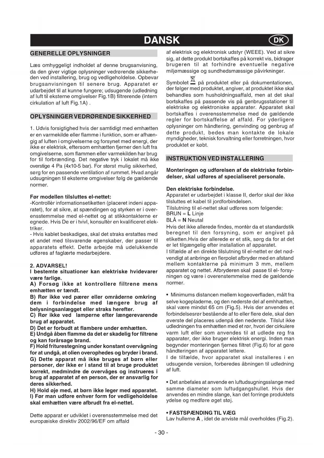 GENERELLE OPLYSNINGER Læs omhyggeligt indholdet af denne brugsanvisning, da den giver vigtige oplysninger vedrørende sikkerhe- den ved installering, brug og vedligeholdelse. Opbevar brugsanvisningen til senere brug. Apparatet er udarbejdet til at kunne fungere; udsugende (udledning af luft til eksterne omgivelser Fig.1B) filtrerende (intern cirkulation af luft Fig.1A) .