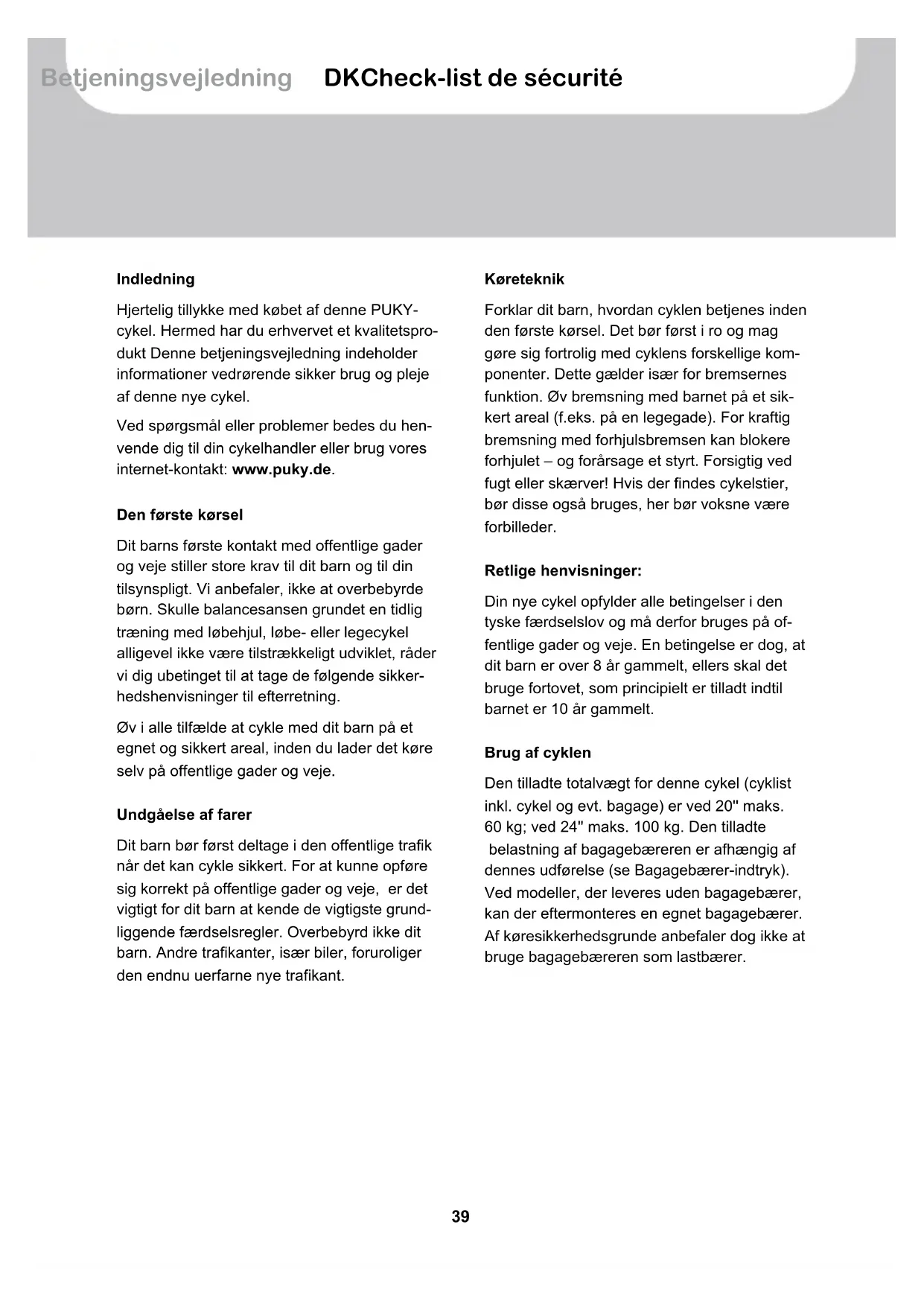 Hjertelig tillykke med købet af denne PUKY-cykel. Hermed har du erhvervet et kvalitetsprodukt Denne betjeningsvejledning indeholder informationer vedrørende sikker brug og pleje af denne nye cykel.