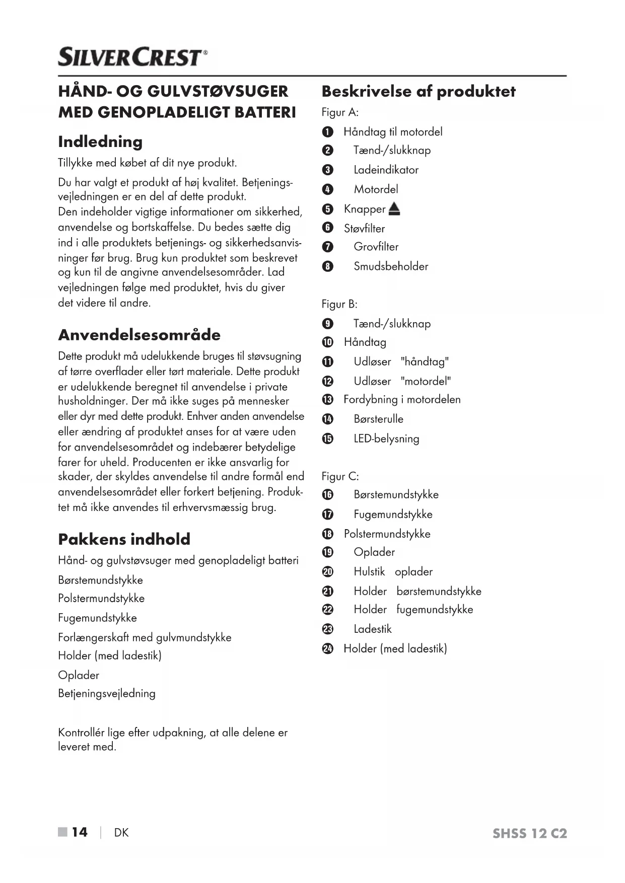 Indledning Tillykke med købet af dit nye produkt. Du har valgt et produkt af høj kvalitet. Betjenings- vejledningen er en del af dette produkt. Den indeholder vigtige informationer om sikkerhed, anvendelse og bortskaffelse. Du bedes sætte dig ind i alle produktets betjenings- og sikkerhedsanvis- ninger før brug. Brug kun produktet som beskrevet og kun til de angivne anvendelsesområder. Lad vejledningen følge med produktet, hvis du giver det videre til andre. Anvendelsesområde Dette produkt må udelukkende bruges til støvsugning af tørre overflader eller tørt materiale. Dette produkt er udelukkende beregnet til anvendelse i private husholdninger. Der må ikke suges på mennesker eller dyr med dette produkt. Enhver anden anvendelse eller ændring af produktet anses for at være uden for anvendelsesområdet og indebærer betydelige farer for uheld. Producenten er ikke ansvarlig for skader, der skyldes anvendelse til andre formål end anvendelsesområdet eller forkert betjening. Produk- tet må ikke anvendes til erhvervsmæssig brug. Pakkens indhold Hånd- og gulvstøvsuger med genopladeligt batteri Børstemundstykke Polstermundstykke Fugemundstykke Forlængerskaft med gulvmundstykke Holder (med ladestik) Oplader Betjeningsvejledning Kontrollér lige efter udpakning, at alle delene er leveret med. Beskrivelse af produktet Figur A: Håndtag til motordel Tænd-/slukknap Ladeindikator Motordel