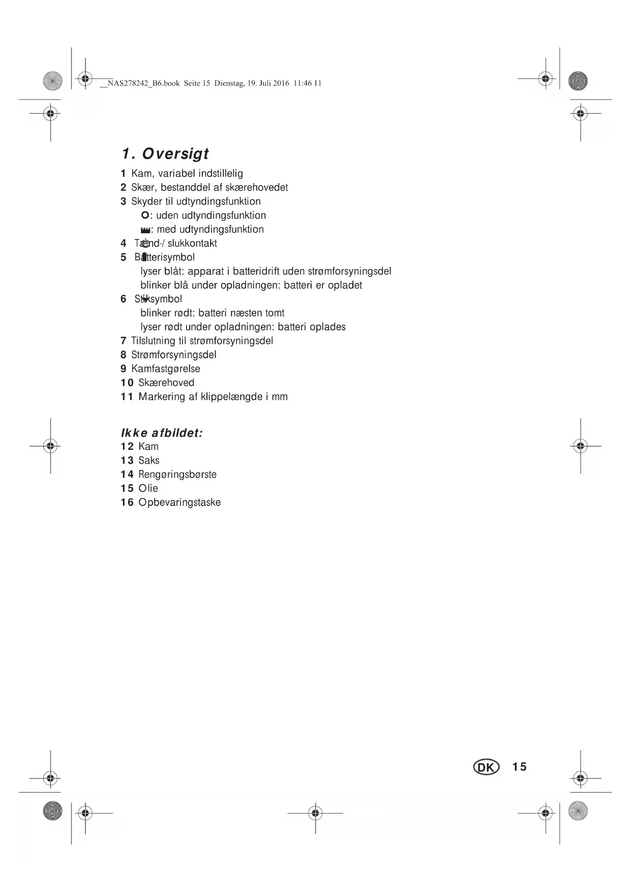 1 Kam, variabel indstillelig 2 Skær, bestanddel af skærehovedet 3 Skyder til udtyndingsfunktion |: uden udtyndingsfunktion : med udtyndingsfunktion 4 Tænd-/slukkontakt 5 Batterisymbol lyser blåt: apparat i batteridrift uden strømforsyningsdel blinker blå under opladningen: batteri er opladet 6 Stiksymbol blinker rødt: batteri næsten tomt lyser rødt under opladningen: batteri oplades 7 Tilslutning til strømforsyningsdel 8 Strømforsyningsdel 9 Kamfastgørelse 10 Skærehoved 11 Markering af klippelængde i mm Ikke afbildet: 12 Kam 13 Saks 14 Rengøringsbørste 15 Olie 16 Opbevaringstaske
