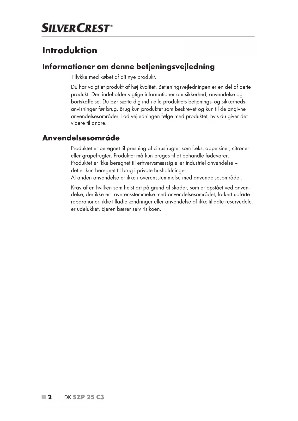 Introduktion Informationer om denne betjeningsvejledning Tillykke med købet af dit nye produkt. Du har valgt et produkt af høj kvalitet. Betjeningsvejledningen er en del af dette produkt. Den indeholder vigtige informationer om sikkerhed, anvendelse og bortskaffelse. Du bør sætte dig ind i alle produktets betjenings- og sikkerheds- anvisninger før brug. Brug kun produktet som beskrevet og kun til de angivne anvendelsesområder. Lad vejledningen følge med produktet, hvis du giver det videre til andre. Anvendelsesområde Produktet er beregnet til presning af citrusfrugter som f.eks. appelsiner, citroner eller grapefrugter. Produktet må kun bruges til at behandle fødevarer. Produktet er ikke beregnet til erhvervsmæssig eller industriel anvendelse – det er kun beregnet til brug i private husholdninger. Al anden anvendelse er ikke i overensstemmelse med anvendelsesområdet. Krav af en hvilken som helst art på grund af skader, som er opstået ved anven- delse, der ikke er i overensstemmelse med anvendelsesområdet, forkert udførte reparationer, ikke-tilladte ændringer eller anvendelse af ikke-tilladte reservedele, er udelukket. Ejeren bærer selv risikoen. IB_340445_SZP25C3_LB6.indb 2 29.07.2020 10:56:04DK