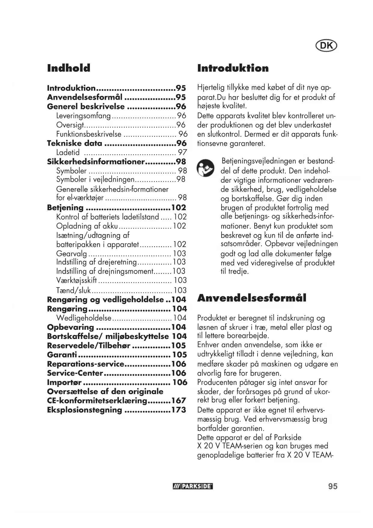 - Introduktion Hjerteligtillykkemedkøbetafditnyeap- parat.Du har besluttet dig for et produkt af højestekvalitet. Dette apparats kvalitet blev kontrolleret un- der produktionen og det blev underkastet en slutkontrol. Dermed er dit apparats funk- tionsevne garanteret. Betjeningsvejledningenerbestand- del af dette produkt. Den indehol- der vigtige informationer vedrøren- de sikkerhed, brug, vedligeholdelse og bortskaffelse. Gør dig inden brugen af produktet fortrolig med allebetjenings-ogsikkerheds-infor- mationer. Benyt kun produktet som beskrevet og kun til de anførte ind- satsområder.Opbevarvejledningen godt og lad alle dokumenter følge med ved videregivelse af produktet tiltredje. Anvendelsesformål Produktet er beregnet til indskruning og løsnen af skruer i træ, metal eller plast og tillettereborearbejde. Enhverandenanvendelse,somikkeer udtrykkeligttilladtidennevejledning,kan medføre skader på maskinen og udgøre en alvorlig fare for brugeren. Producenten påtager sig intet ansvar for skader, der forårsages på grund af ukor- rektbrugellerforkertbetjening. Dette apparat er ikke egnet til erhvervs- mæssig brug. Ved erhvervsmæssig brug bortfalder garantien. Dette apparat er del af Parkside X20VTEAM-serienogkanbrugesmed genopladeligebatterierfraX20VTEAM- Oversættelse af den originale CE-konformitetserklæring p. 167