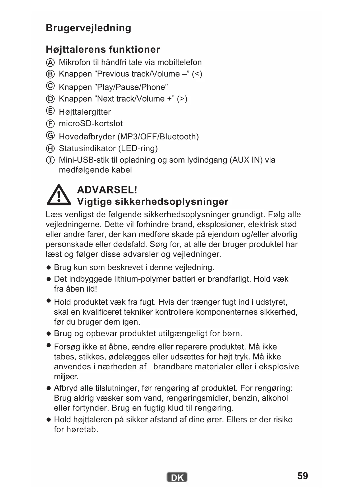 Mini-USB-stik til opladning og som lydindgang (AUX IN) via medfølgende kabel ADVARSEL! Vigtige sikkerhedsoplysninger Læs venligst de følgende sikkerhedsoplysninger grundigt. Følg alle vejledningerne. Dette vil forhindre brand, eksplosioner, elektrisk stød eller andre farer, der kan medføre skade på ejendom og/eller alvorlig personskade eller dødsfald. Sørg for, at alle der bruger produktet har læst og følger disse advarsler og vejledninger.