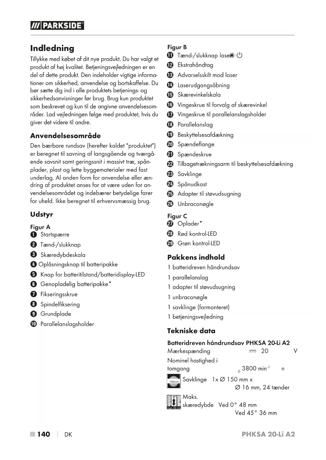 DK Indledning Tillykke med købet af dit nye produkt. Du har valgt et produkt af høj kvalitet. Betjeningsvejledningen er en del af dette produkt. Den indeholder vigtige informa- tioner om sikkerhed, anvendelse og bortskaffelse. Du bør sætte dig ind i alle produktets betjenings- og sikkerhedsanvisninger før brug. Brug kun produktet som beskrevet og kun til de angivne anvendelsesom- råder. Lad vejledningen følge med produktet, hvis du giver det videre til andre. Anvendelsesområde Den bærbare rundsav (herefter kaldet "produktet") er beregnet til savning af langsgående og tværgå- ende savsnit samt geringssnit i massivt træ, spån- plader, plast og lette byggematerialer med fast underlag. Al anden form for anvendelse eller æn- dring af produktet anses for at være uden for an- vendelsesområdet og indebærer betydelige farer for uheld. Ikke beregnet til erhvervsmæssig brug. Udstyr Figur A Startspærre Tænd-/slukknap Skæredybdeskala Oplåsningsknap til batteripakke Knap for batteritilstand/batteridisplay-LED Genopladelig batteripakke* Fikseringsskrue Spindelfiksering Grundplade Parallelanslagsholder Figur B Tænd-/slukknap laser Ekstrahåndtag Advarselsskilt mod laser Laserudgangsåbning Skærevinkelskala Vingeskrue til forvalg af skærevinkel Vingeskrue til parallelanslagsholder Parallelanslag Beskyttelsesafdækning Spændeflange Spændeskrue Tilbagetrækningsarm til beskyttelsesafdækning Savklinge Spånudkast Adapter til støvudsugning Unbraconøgle Figur C Oplader* Rød kontrol-LED Grøn kontrol-LED Pakkens indhold 1 batteridreven håndrundsav 1 parallelanslag 1 adapter til støvudsugning 1 unbraconøgle 1 savklinge (formonteret) 1 betjeningsvejledning Tekniske data Batteridreven håndrundsav PHKSA 20-Li A2 Mærkespænding 20 V (jævnstrøm) Nominel hastighed i tomgang n