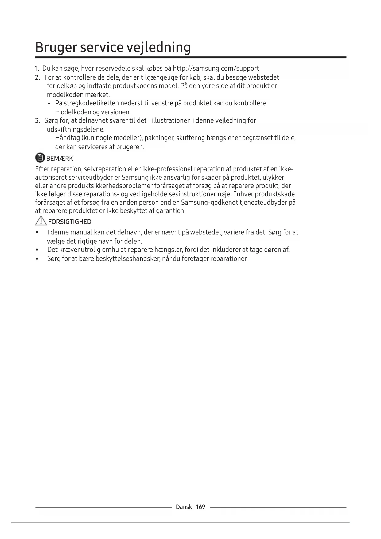 udskiftningsdelene. ‐ Håndtag (kun nogle modeller), pakninger, skuffer og hængsler er begrænset til dele, der kan serviceres af brugeren. BEMÆRK Efter reparation, selvreparation eller ikke-professionel reparation af produktet af en ikke- autoriseret serviceudbyder er Samsung ikke ansvarlig for skader på produktet, ulykker eller andre produktsikkerhedsproblemer forårsaget af forsøg på at reparere produkt, der ikke følger disse reparations- og vedligeholdelsesinstruktioner nøje. Enhver produktskade forårsaget af et forsøg fra en anden person end en Samsung-godkendt tjenesteudbyder på at reparere produktet er ikke beskyttet af garantien. FORSIGTIGHED