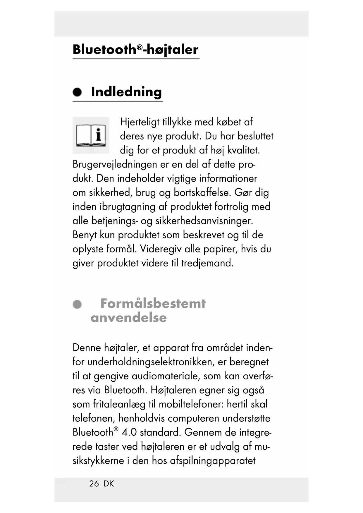 -højtaler Indledning Hjerteligt tillykke med købet af deres nye produkt. Du har besluttet dig for et produkt af høj kvalitet. Brugervejledningen er en del af dette pro- dukt. Den indeholder vigtige informationer om sikkerhed, brug og bortskaffelse. Gør dig inden ibrugtagning af produktet fortrolig med alle betjenings- og sikkerhedsanvisninger. Benyt kun produktet som beskrevet og til de oplyste formål. Videregiv alle papirer, hvis du giver produktet videre til tredjemand. Formålsbestemt anvendelse Denne højtaler, et apparat fra området inden- for underholdningselektronikken, er beregnet til at gengive audiomateriale, som kan overfø- res via Bluetooth. Højtaleren egner sig også som fritaleanlæg til mobiltelefoner: hertil skal telefonen, henholdvis computeren understøtte Bluetooth