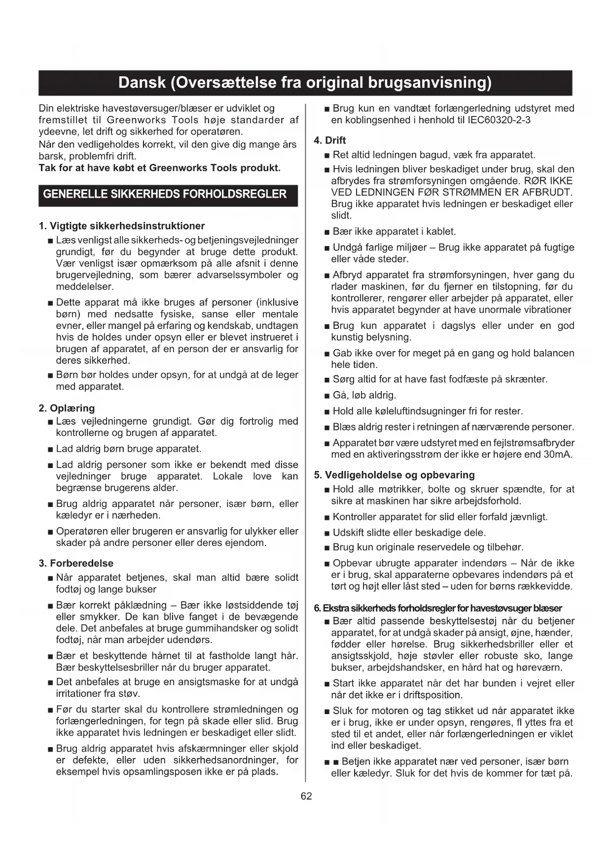 Dansk (Oversættelse fra original brugsanvisning) MONTERING UDPAKNING ■ Tag forsigtigt produktet og alt tilbehøret ud af kassen. ■ Inspicér produktet omhyggeligt for evt. brud eller skader opstået under transporten. ■ Undlad at bortskaffe indpakningsmaterialet, før du har inspiceret produktet omhyggeligt og anvendt ■ produktet. ■ I tilfælde af beskadigede eller manglende dele kontaktes Greenworks Tools-servicecenter for assistance. Blæse-sugeren leveres med umonterede komponenter. Disse samles ved at følge nedenstående fremgangsmåde: SAMLING SOM BIOKLIPPER (Fig. 2) ■ Pres forreste og bageste bioklipslanger sammen, så de låser. (Se fig. 2) ■ Træk låseknappen frem, så åbningen løsnes. Hold åbningen åben. (Se fig. 2,1) ■ Indsæt den “kileformede” endeklemme af bioklipslangen i bagklemmen. (Se fig. 2.2). Pres den “krogformede” endeklemme af bioklipslangen ind i forklemmen. (Se fig. 2.3). Pres låseknappen tilbage for at fastspænde bioklipslangen. (Se fig. 2.4) ■ Man fjerner bioklipslangerne ved at følge trin (3) (2) (1). ■ Indsæt poseadapteren i blæser-udgangen. Lås poseadapteren fast med låseknappen. Man fjerner posen ved blot at trykke på låseknappen og tage posen ud. (se Fig. 4). BEMÆRK: Det kan være nødvendigt at fjerne blæseslangen eller bioklipslangerne for at rense en tilstoppet slange eller et blokeret skovlhjul. ADVARSEL: For at forebygge alvorlige personskader skal man huske at stille kontakten i pos. OFF (=SLUKKET), trække stikket ud af kontakten og stoppe skovlhjulene, inden man på- eller afmonterer slanger. SAMLING SOM BLÆSER (Fig. 3) ■ Pres blæseslangen fremad, til de indkærvede områder på blæsehuset klikker ind i rillerne på slangen. MONTERING AF POSE MED SKULDERSTROP (Fig. 4) ■ Man stiller sig i betjeningsposition og justerer længden i forhold til sin kropsstørrelse. Afstanden bliver længere, når man trækker i tappen, og kortere, når man trækker i stroppen. BETJENING TILSLUTNING AF STRØMFORSYNINGSKABEL (Fig. 5) ■ Fastgør forlængerkablet til motorhuset ved hjælp af knasten bag på blæseren. Herved forebygger man utilsigtet udtrækning af strømforsyningskablet. ■ Indsæt strømforsyningskablets hunstik i stikkontakten bag på produktet. START/STOP AF BLÆSEREN/BIOKLIPPEREN (Fig. 6) ■ Sådan tændes produktet: Stil kontakten i pos. ON (=TÆNDT). ■ Drej skiven fremad for at øge hastigheden. ■ Sådan slukkes produktet: Stil kontakten i pos. OFF (=SLUKKET). VIGTIGT: I bioklipmodus SKAL blæseren være indstillet til høj hastighed. SÅDAN HOLDER MAN BLÆSEREN/BIOKLIPPEREN Inden man anvender produktet, skal man stille sig i betjeningsposition. Kontrollér følgende: ■ Operatøren er iført korrekt beklædning såsom støvler, sikkerhedsbriller, høreværn, handsker, lange busker og en skjorte med lange ærmer. ADVARSEL For at forebygge alvorlige personskader skal man altid benytte sikkerhedsbriller, som overholder standarden ANSI Z87.1, når man bruger dette produkt. Brug ansigtsmaske eller støvmaske i støvede omgivelser. ADVARSEL For at forebygge alvorlige personskader eller skader på produktet skal man sikre sig, at blæseslangen eller bioklipslangerne og posen er monteret korrekt, inden man anvender produktet. BRUGSTIPS (Fig. 7) ■ Posen er monteret og lynet til (ved anvendelse som bioklipper). ■ Kontrollér, at posen er lynet til, inden produktet tages i brug. ■ Kontrollér, at produktet ikke peger på personer eller løst affald, inden det startes. ■ Kontrollér, at produktet er i god stand. Kontrollér, at alle slangerne og skærmene er ordentligt monteret. ■ Hold altid produktet fast med begge hænder under arbejdet. ■ Hold godt fast i både for- og baghåndtag eller -greb. ■ For at minimere faren for høretab som følge af stjniveauet skal man benytte høreværn.67 Dansk (Oversættelse fra original brugsanvisning) ■ Brug skulderstroppen, når produktet anvendes som bioklipper. ■ Brug kun eludstyret på rimelige tidspunkter - dvs. ikke tidligt om morgenen eller sent om aftenen, hvor man risikerer at genere andre. Overhold tidsangivelserne ifølge lokale (miljø)regler. Normalt anbefalede arbejdstidspunkter er fra kl. 9:00 til kl. 17:00, mandag til lørdag. ■ Man kan reducere støjniveauet ved at begrænse antallet af udstyrsdele, der bruges på samme tid. ■ Man kan reducere støjniveauet ved at køre elblæseren med lavest mulig hastighed. ■ Brug river og koste til løsning af affald, inden der blæses. ■ I støvede omgivelser skal overfladerne fugtes en smule. ■ Man kan spare vand ved at bruge elblæsere i stedet for slanger til mange forskellige plæne- og haveformål, inkl. områder som rendesten, læskærme, terrasser, grillpladser, verandaer og haver. ■ Hold øje med børn, dyr, åbne vinduer, nyvaskede biler, og sørg for at blæse affald bort på sikker vis. ■ Husk at rydde op efter brug af blæsere eller andet udstyr. Affald skal bortskaffes iht. gældende (miljø) regler. BEMÆRK: Sørg for, at bioklip-/sugeåbningen er helt lukket og låst. VENTILATIONSÅBNINGER ■ Ventilationsåbningerne må aldrig tildækkes. De skal holdes fri for forhindringer og affald. De skal altid være helt åbne af hensyn til kotorkølingen. ADVARSEL For at forebygge alvorlige personskader skal man undgå at benytte løstsiddende tøj eller genstande som tørklæder, snore, kæder, slips, mv., som kan blive trukket ind i ventilationsåbningerne. Sørg for at langt hår ikke bliver trukket ind i ventilationsåbningerne; langt hår skal bindes op.
