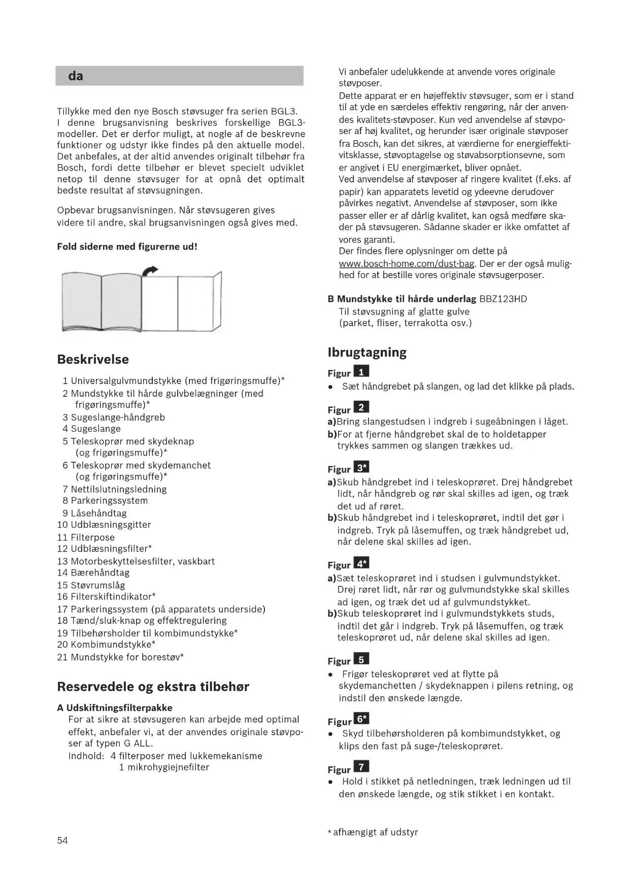 afhankelijk van de uitvoering54 Tillykke med den nye Bosch støvsuger fra serien BGL3. I denne brugsanvisning beskrives forskellige BGL3- modeller. Det er derfor muligt, at nogle af de beskrevne funktioner og udstyr ikke findes på den aktuelle model. Det anbefales, at der altid anvendes originalt tilbehør fra Bosch, fordi dette tilbehør er blevet specielt udviklet netop til denne støvsuger for at opnå det optimalt bedste resultat af støvsugningen. Opbevar brugsanvisningen. Når støvsugeren gives videre til andre, skal brugsanvisningen også gives med. Fold siderne med figurerne ud! Beskrivelse 1 Universalgulvmundstykke (med frigøringsmuffe)* 2 Mundstykke til hårde gulvbelægninger (med frigøringsmuffe)* 3 Sugeslange-håndgreb 4 Sugeslange 5 Teleskoprør med skydeknap (og frigøringsmuffe)* 6 Teleskoprør med skydemanchet (og frigøringsmuffe)* 7 Nettilslutningsledning 8 Parkeringssystem 9 Låsehåndtag 10 Udblæsningsgitter 11 Filterpose 12 Udblæsningsfilter* 13 Motorbeskyttelsesfilter, vaskbart 14 Bærehåndtag 15 Støvrumslåg 16 Filterskiftindikator* 17 Parkeringssystem (på apparatets underside) 18 Tænd/sluk-knap og effektregulering 19 Tilbehørsholder til kombimundstykke* 20 Kombimundstykke* 21 Mundstykke for borestøv* Reservedele og ekstra tilbehør A Udskiftningsfilterpakke For at sikre at støvsugeren kan arbejde med optimal effekt, anbefaler vi, at der anvendes originale støvpo- ser af typen G ALL. Indhold: 4 filterposer med lukkemekanisme 1 mikrohygiejnefilter Vi anbefaler udelukkende at anvende vores originale støvposer. Dette apparat er en højeffektiv støvsuger, som er i stand til at yde en særdeles effektiv rengøring, når der anven- des kvalitets-støvposer. Kun ved anvendelse af støvpo- ser af høj kvalitet, og herunder især originale støvposer fra Bosch, kan det sikres, at værdierne for energieffekti- vitsklasse, støvoptagelse og støvabsorptionsevne, som er angivet i EU energimærket, bliver opnået. Ved anvendelse af støvposer af ringere kvalitet (f.eks. af papir) kan apparatets levetid og ydeevne derudover påvirkes negativt. Anvendelse af støvposer, som ikke passer eller er af dårlig kvalitet, kan også medføre ska- der på støvsugeren. Sådanne skader er ikke omfattet af vores garanti. Der findes flere oplysninger om dette på www.bosch-home.com/dust-bag . Der er der også mulig- hed for at bestille vores originale støvsugerposer. B Mundstykke til hårde underlag BBZ123HD Til støvsugning af glatte gulve (parket, fliser, terrakotta osv.) Ibrugtagning Figur ● Sæt håndgrebet på slangen, og lad det klikke på plads. Figur a)Bring slangestudsen i indgreb i sugeåbningen i låget. b)For at fjerne håndgrebet skal de to holdetapper trykkes sammen og slangen trækkes ud. Figur a)Skub håndgrebet ind i teleskoprøret. Drej håndgrebet lidt, når håndgreb og rør skal skilles ad igen, og træk det ud af røret. b)Skub håndgrebet ind i teleskoprøret, indtil det gør i indgreb. Tryk på låsemuffen, og træk håndgrebet ud, når delene skal skilles ad igen. Figur a)Sæt teleskoprøret ind i studsen i gulvmundstykket. Drej røret lidt, når rør og gulvmundstykke skal skilles ad igen, og træk det ud af gulvmundstykket. b)Skub teleskoprøret ind i gulvmundstykkets studs, indtil det går i indgreb. Tryk på låsemuffen, og træk teleskoprøret ud, når delene skal skilles ad igen. Figur ● Frigør teleskoprøret ved at flytte på skydemanchetten / skydeknappen i pilens retning, og indstil den ønskede længde. Figur ● Skyd tilbehørsholderen på kombimundstykket, og klips den fast på suge-/teleskoprøret. Figur ● Hold i stikket på netledningen, træk ledningen ud til den ønskede længde, og stik stikket i en kontakt.
