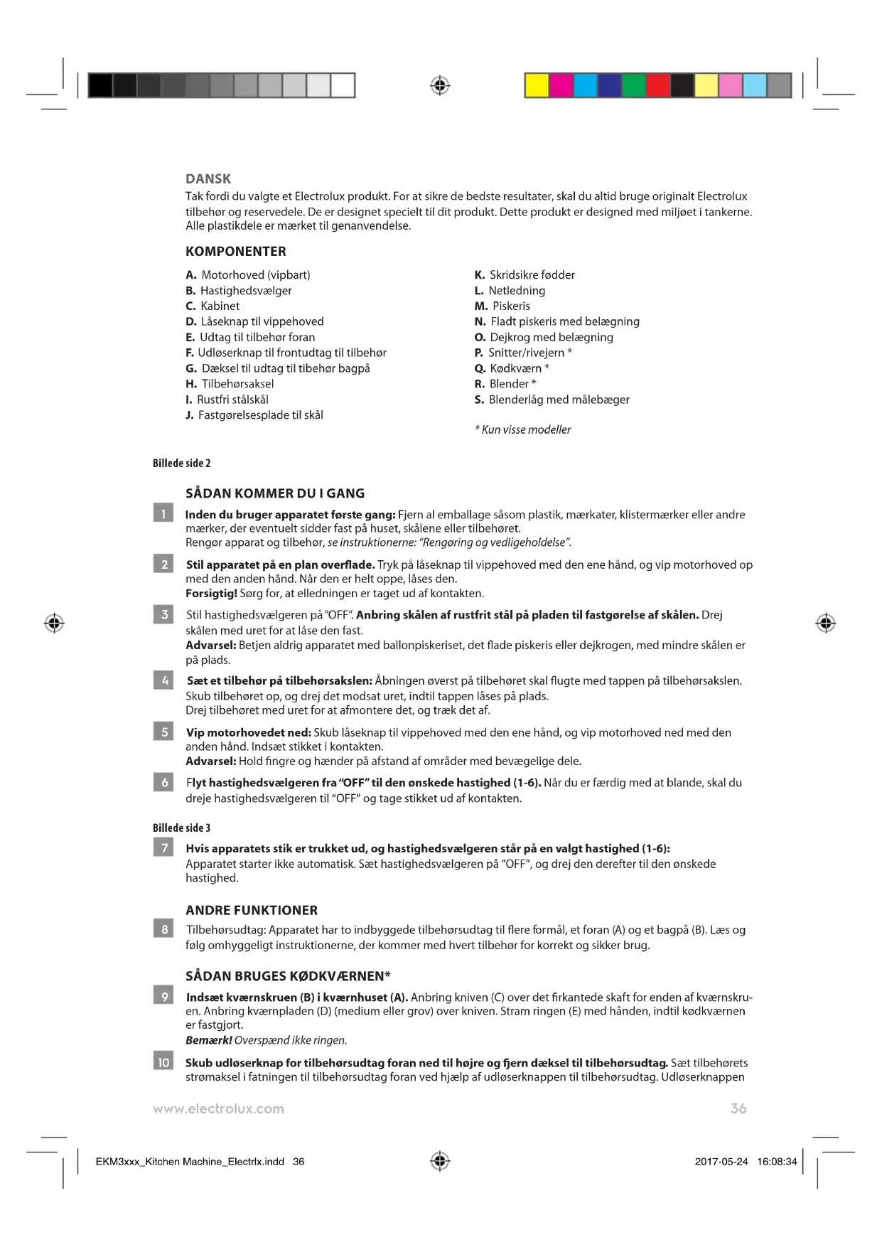 *Bei der Zubereitung von Hefeteig keine höhere Geschwindigkeit als Stufe 2 einstellen. Der Mixer kann dadurch beschädigt werden. EKM3xxx_Kitchen Machine_Electrlx.indd 35 2017-05-24 16:08:3436 www.electrolux.com DANSK Tak fordi du valgte et Electrolux produkt. For at sikre de bedste resultater, skal du altid bruge originalt Electrolux tilbehør og reservedele. De er designet specielt til dit produkt. Dette produkt er designed med miljøet i tankerne. Alle plastikdele er mærket til genanvendelse. KOMPONENTER A. Motorhoved (vipbart) B. Hastighedsvælger C. Kabinet D. Låseknap til vippehoved E. Udtag til tilbehør foran F. Udløserknap til frontudtag til tilbehør G. Dæksel til udtag til tibehør bagpå H. Tilbehørsaksel