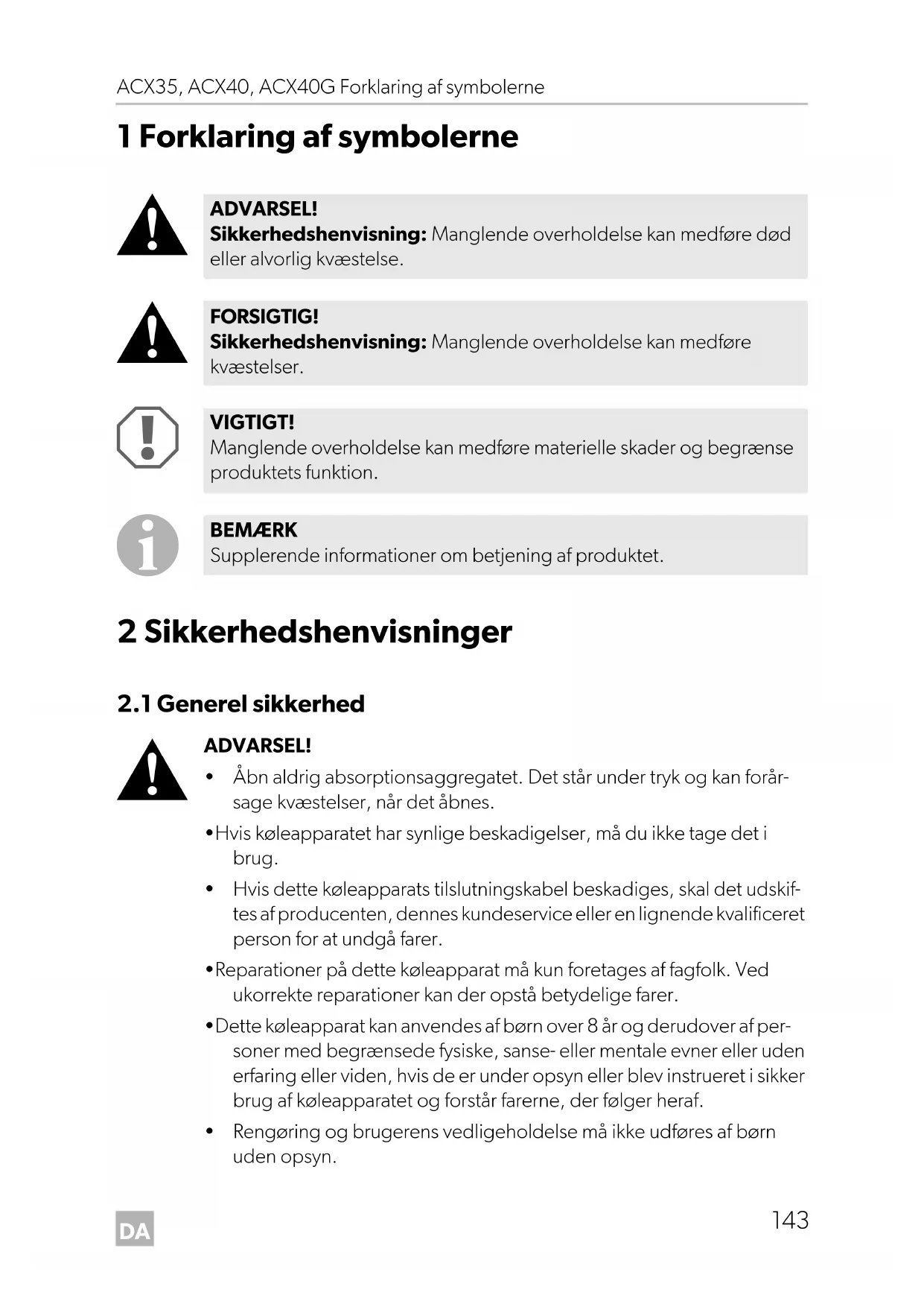 - Rengøring og brugerens vedligeholdelse må ikke udføres af børn uden opsyn. ADVARSEL! Sikkerhedshenvisning: Manglende overholdelse kan medføre død eller alvorlig kvæstelse. FORSIGTIG! Sikkerhedshenvisning: Manglende overholdelse kan medføre kvæstelser. VIGTIGT! Manglende overholdelse kan medføre materielle skader og begrænse produktets funktion. BEMÆRK Supplerende informationer om betjening af produktet. ACX35-ACX40-ACX40G-O-15s.book Seite 143 Freitag, 22. September 2017 6:24 18DA Sikkerhedshenvisninger ACX35, ACX40, ACX40G