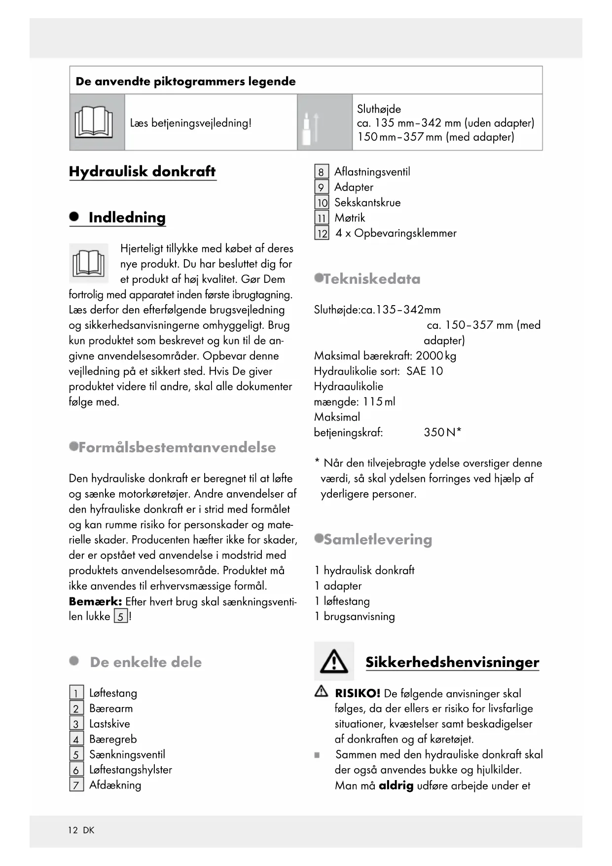 - Når den tilvejebragte ydelse overstiger denne værdi, så skal ydelsen forringes ved hjælp af yderligere personer. Samlet levering 1 hydraulisk donkraft 1 adapter 1 løftestang 1 brugsanvisning Sikkerhedshenvisninger RISIKO! De følgende anvisninger skal følges, da der ellers er risiko for livsfarlige situationer, kvæstelser samt beskadigelser af donkraften og af køretøjet. Sammen med den hydrauliske donkraft skal der også anvendes bukke og hjulkilder. Man må aldrig udføre arbejde under et13 DK løftet køretøj når der ikke er truffet yderligere sikkerhedsforanstaltninger. På den måde hindrer man at køretøjet kan rulle bort, skride eller vælte omkuld. Løfteapparatet er kun egnet til løftning. Donkraften må kun benyttes på faste og jævne flader. På ubefæstede og ujævne flader – f.eks. på skærvelag – kan man risikere at lasten skrider.