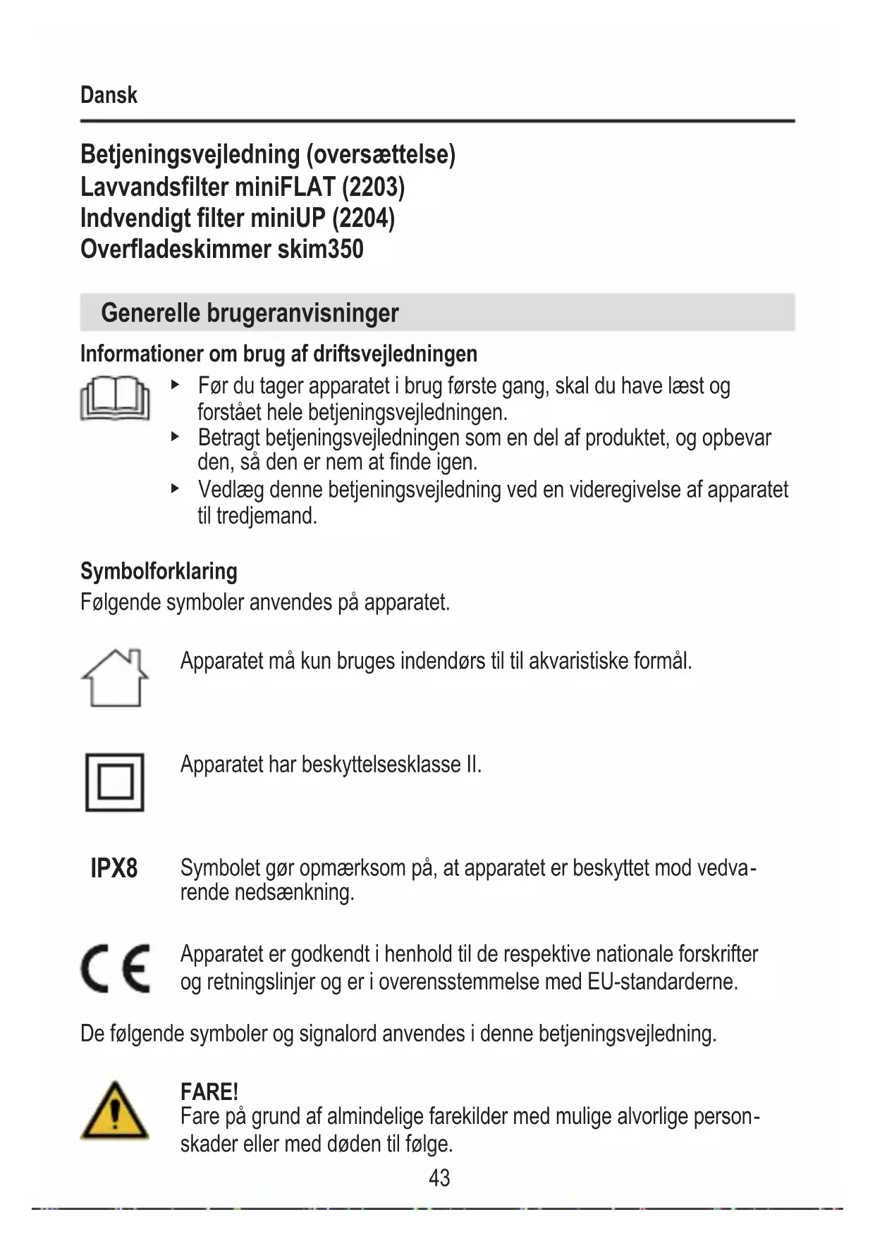 Betjeningsvejledning (oversættelse) Lavvandslter miniFLAT (2203) Indvendigt lter miniUP (2204) Overadeskimmer skim350 Generelle brugeranvisninger Informationer om brug af driftsvejledningen ▶ Før du tager apparatet i brug første gang, skal du have læst og forstået hele betjeningsvejledningen. ▶ Betragt betjeningsvejledningen som en del af produktet, og opbevar den, så den er nem at nde igen. ▶ Vedlæg denne betjeningsvejledning ved en videregivelse af apparatet til tredjemand. Symbolforklaring Følgende symboler anvendes på apparatet. Apparatet må kun bruges indendørs til til akvaristiske formål. Apparatet har beskyttelsesklasse II. Symbolet gør opmærksom på, at apparatet er beskyttet mod vedva