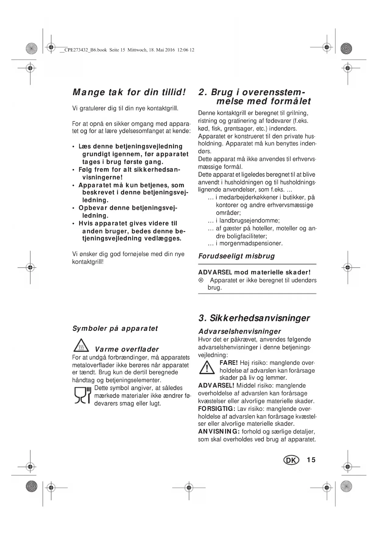 melse med formålet Denne kontaktgrill er beregnet til grilning, ristning og gratinering af fødevarer (f.eks. kød, fisk, grøntsager, etc.) indendørs. Apparatet er konstrueret til den private hus- holdning. Apparatet må kun benyttes inden- dørs. Dette apparat må ikke anvendes til erhvervs- mæssige formål. Dette apparat et ligeledes beregnet til at blive anvendt i husholdningen og til husholdnings- lignende anvendelser, som f.eks. ... … i medarbejderkøkkener i butikker, på kontorer og andre erhvervsmæssige områder; … i landbrugsejendomme; … af gæster på hoteller, moteller og an- dre boligfaciliteter; … i morgenmadspensioner. Forudseeligt misbrug ADVARSEL mod materielle skader! ~ Apparatet er ikke beregnet til udendørs brug.