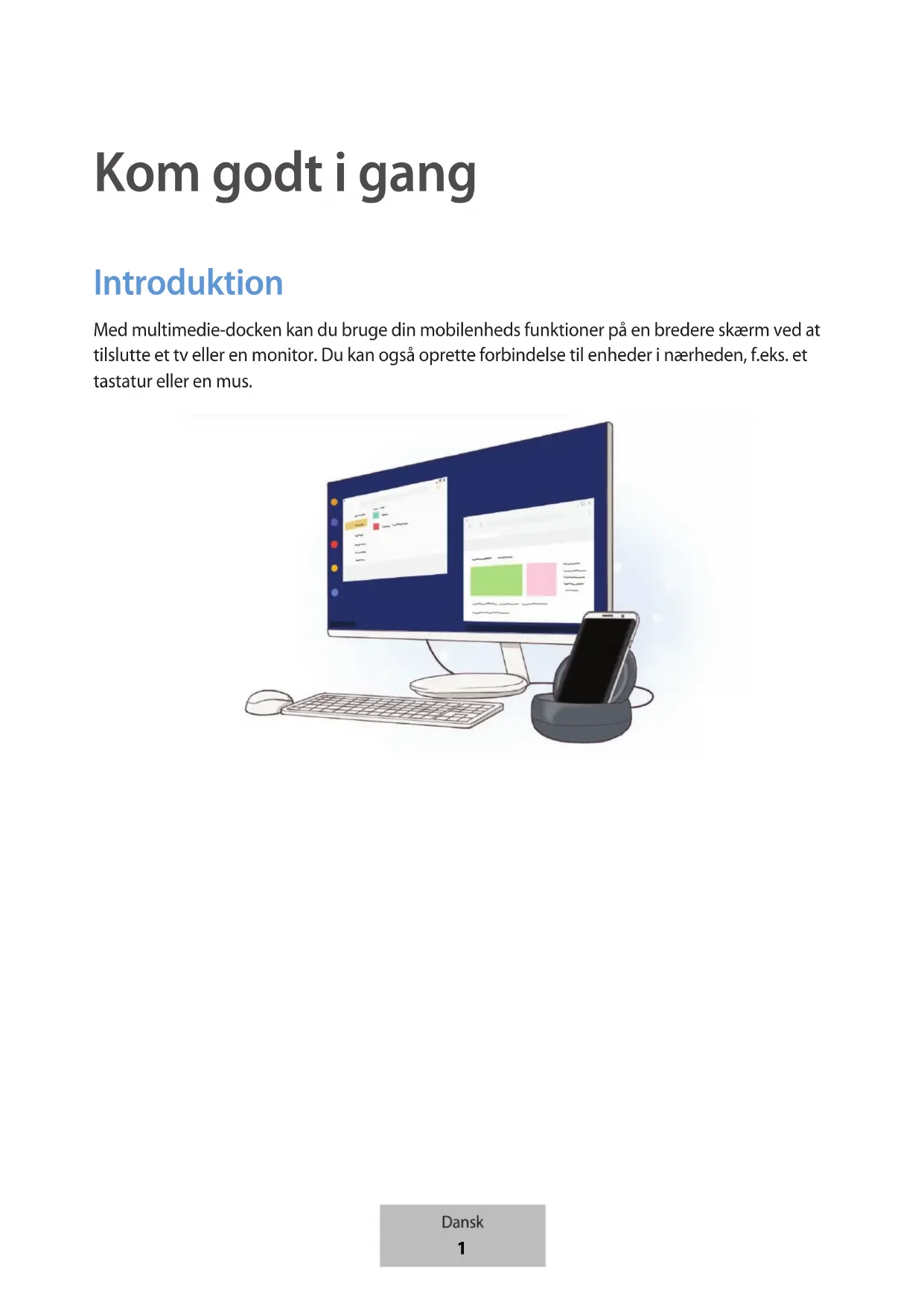 Kom godt i gang Introduktion Med multimedie-docken kan du bruge din mobilenheds funktioner på en bredere skærm ved at tilslutte et tv eller en monitor. Du kan også oprette forbindelse til enheder i nærheden, f.eks. et tastatur eller en mus. Dansk 1Kom godt i gang