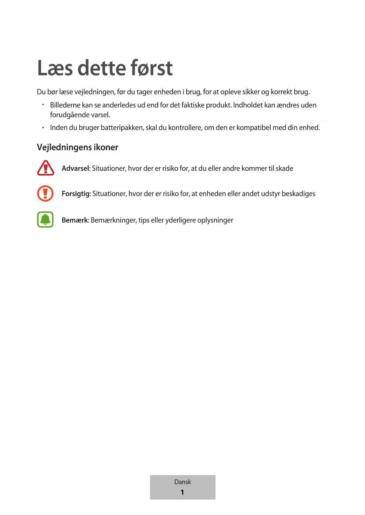 Inden du bruger batteripakken, skal du kontrollere, om den er kompatibel med din enhed. Vejledningens ikoner Advarsel: Situationer, hvor der er risiko for, at du eller andre kommer til skade Forsigtig: Situationer, hvor der er risiko for, at enheden eller andet udstyr beskadiges Bemærk: Bemærkninger, tips eller yderligere oplysninger Dansk
