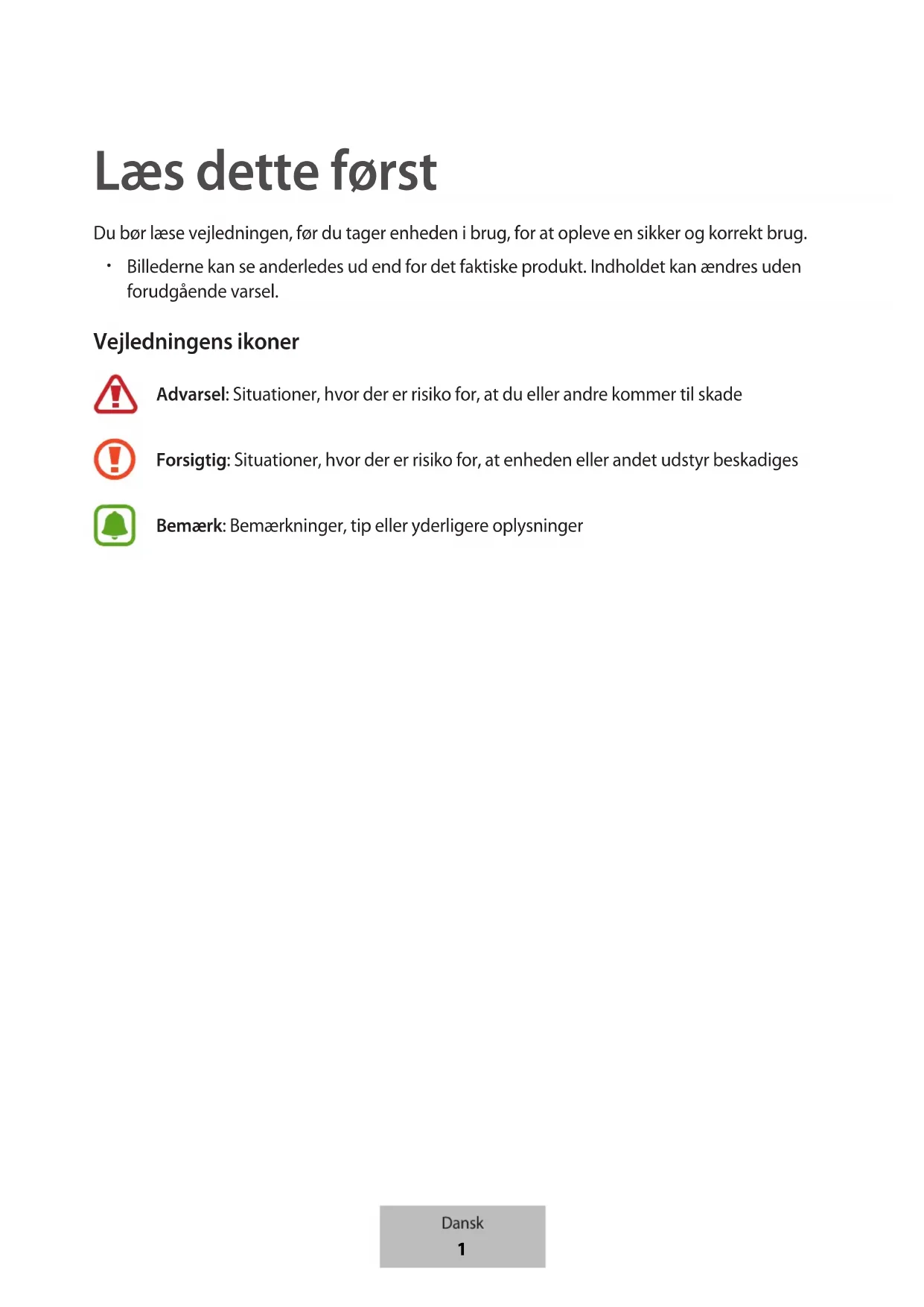 Læs dette først Du bør læse vejledningen, før du tager enheden i brug, for at opleve en sikker og korrekt brug.