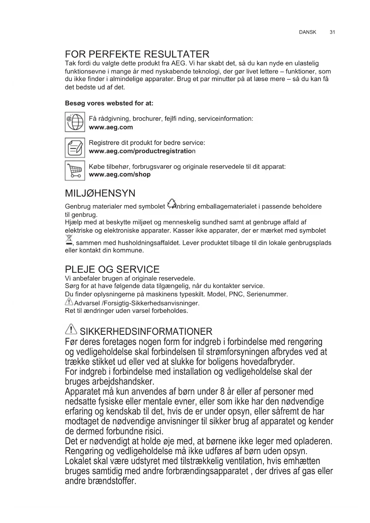 Tak fordi du valgte dette produkt fra AEG. Vi har skabt det, så du kan nyde en ulastelig funktionsevne i mange år med nyskabende teknologi, der gør livet lettere – funktioner, som du ikke fi nder i almindelige apparater. Brug et par minutter på at læse mere – så du kan få det bedste ud af det. Besøg vores websted for at: Få rådgivning, brochurer, fejlfi nding, serviceinformation: www.aeg.com Registrere dit produkt for bedre service: www.aeg.com/productregistration Købe tilbehør, forbrugsvarer og originale reservedele til dit apparat: www.aeg.com/shop MILJØHENSYN Genbrug materialer med symbolet . Anbring emballagematerialet i passende beholdere til genbrug. Hjælp med at beskytte miljøet og menneskelig sundhed samt at genbruge affald af elektriske og elektroniske apparater. Kasser ikke apparater, der er mærket med symbolet , sammen med husholdningsaffaldet. Lever produktet tilbage til din lokale genbrugsplads eller kontakt din kommune.