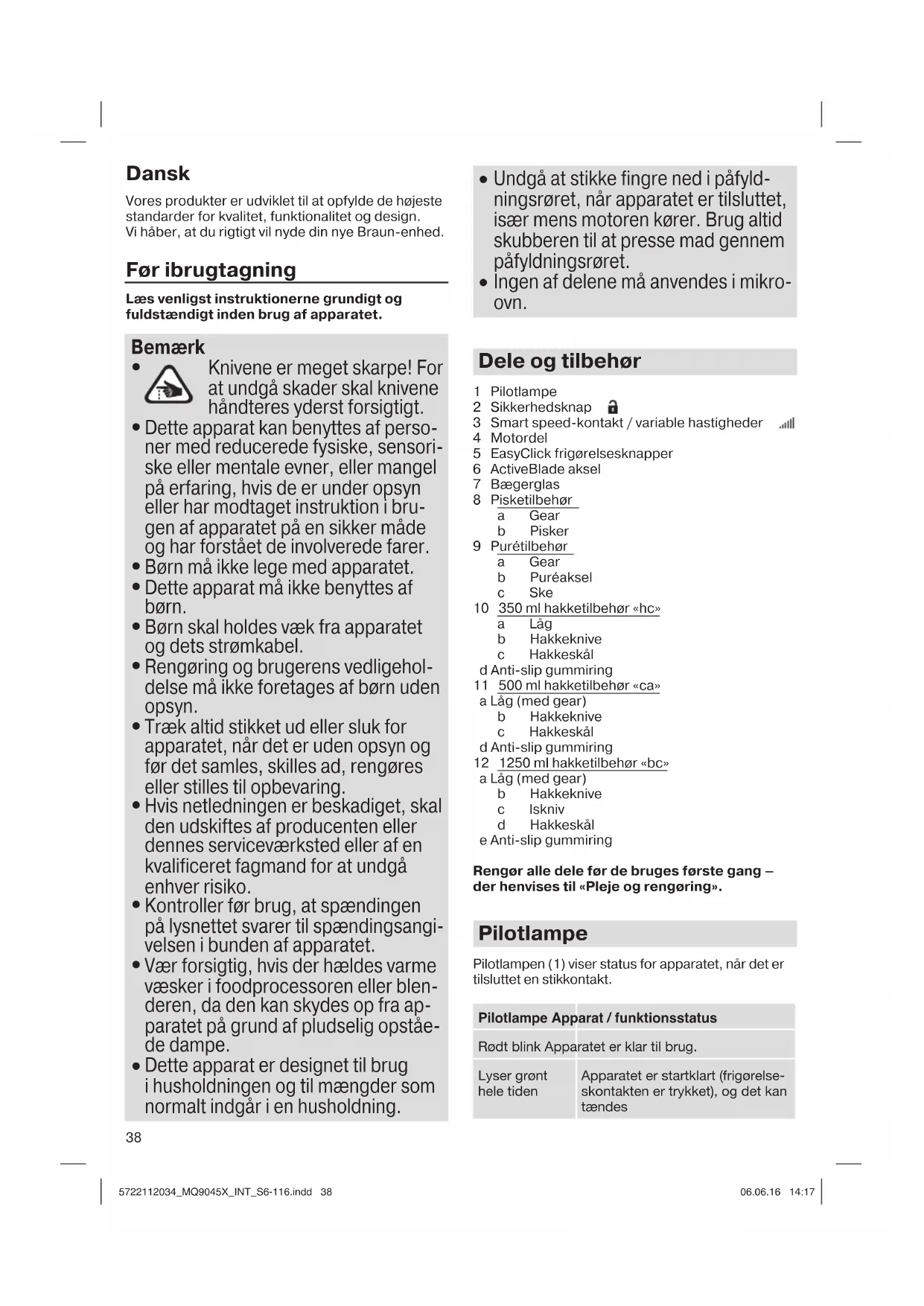 Ingen af delene må anvendes i mikro- ovn. Dele og tilbehør 1 Pilotlampe 2 Sikkerhedsknap 3 Smart speed-kontakt / variable hastigheder 4 Motordel 5 EasyClick frigørelsesknapper 6 ActiveBlade aksel 7 Bægerglas 8 Pisketilbehør a Gear b Pisker 9 Purétilbehør a Gear b Puréaksel c Ske 10 350 ml hakketilbehør «hc» a Låg b Hakkeknive c Hakkeskål d Anti-slip gummiring 11 500 ml hakketilbehør «ca» a Låg (med gear) b Hakkeknive c Hakkeskål d Anti-slip gummiring 12 1250 ml hakketilbehør «bc» a Låg (med gear) b Hakkeknive c Iskniv d Hakkeskål e Anti-slip gummiring Rengør alle dele før de bruges første gang – der henvises til «Pleje og rengøring». Pilotlampe Pilotlampen (1) viser status for apparatet, når det er tilsluttet en stikkontakt. Pilotlampe Apparat / funktionsstatus Rødt blink Apparatet er klar til brug. Lyser grønt hele tiden Apparatet er startklart (frigørelse- skontakten er trykket), og det kan tændes 5722112034_MQ9045X_INT_S6-116.indd 385722112034_MQ9045X_INT_S6-116.indd 38 06.06.16 14:1706.06.16 14:1739 Lyser rødt hele tiden Tidlig advarsel om overophed- ning. Motoren går ned i hastig- hed, trin for trin, indtil den slukker. Lad enheden køle af. Den er klar til brug igen, når pilotlampen blinker rødt. Hvis den maksimale hastighed falder under høj belastning og en lang køretid, kan du stadig afslutte din tilberedning, men du skal lade apparatet køle ned bagefter. Sådan bruges apparatet Smart speed-kontakt til variable hastigheder Et tryk, alle hastigheder. Jo mere der trykkes, jo højere hastighed. Jo højere hastighed, jo hurtigere og finere blande- og snitteresultater. Enhåndsbetjening: Smart speed-kontakten (3) gør det muligt at tænde for apparatet og kontrollere hastigheden med én hånd. Betjening af håndblenderen Første brug: Fjern transportlåsen fra motordelen (4) ved at trække i den på den røde rem. Tænd (A) Apparatet er udstyret med en sikkerhedsknap til aktivering af Smart speed-kontakten. For en sikker opstart, skal disse punkter følges: