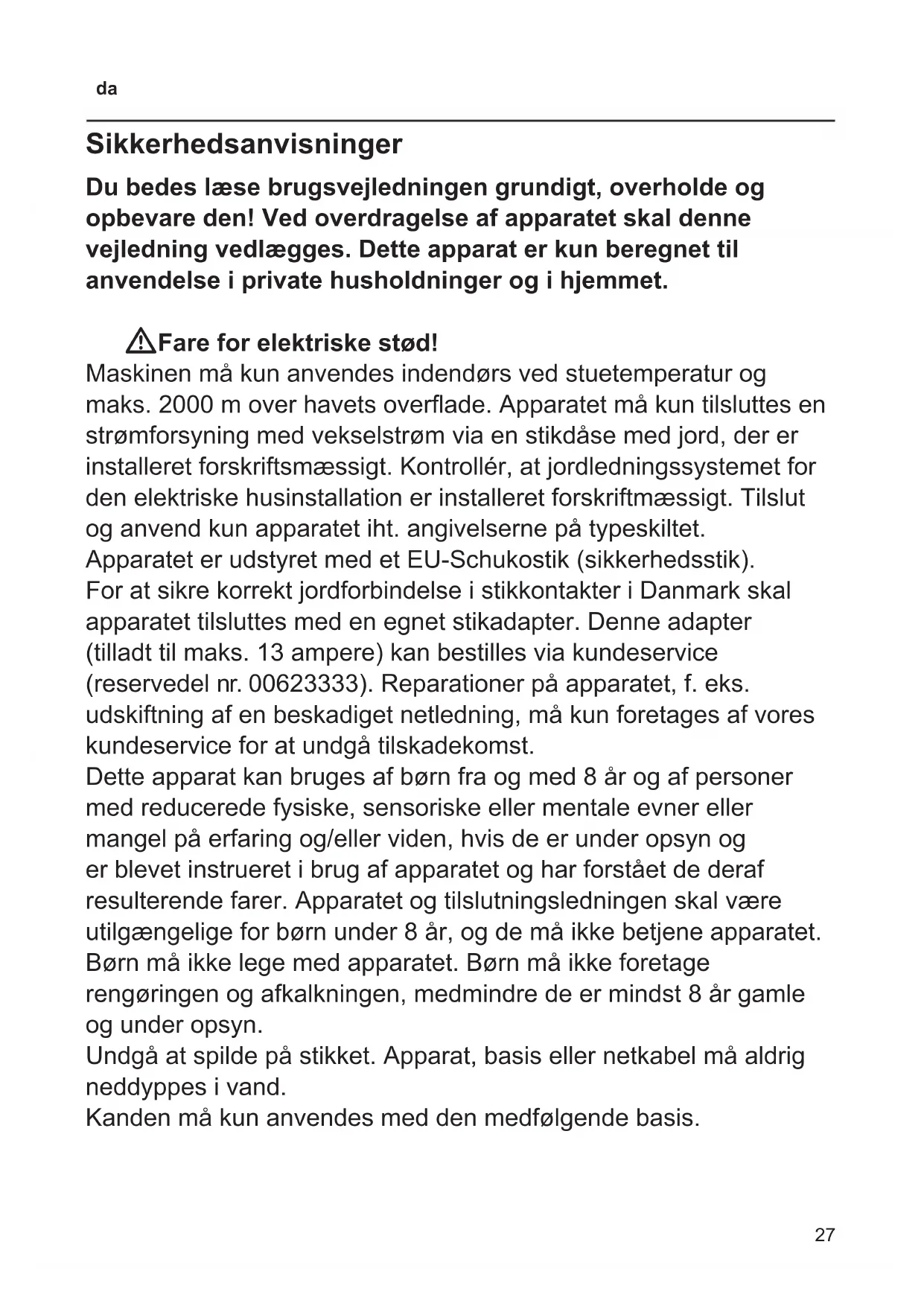 Sikkerhedsanvisninger Du bedes læse brugsvejledningen grundigt, overholde og opbevare den! Ved overdragelse af apparatet skal denne vejledning vedlægges. Dette apparat er kun beregnet til anvendelse i private husholdninger og i hjemmet. WFare for elektriske stød! Maskinen må kun anvendes indendørs ved stuetemperatur og maks. 2000 m over havets overade. Apparatet må kun tilsluttes en strømforsyning med vekselstrøm via en stikdåse med jord, der er installeret forskriftsmæssigt. Kontrollér, at jordledningssystemet for den elektriske husinstallation er installeret forskriftmæssigt. Tilslut og anvend kun apparatet iht. angivelserne på typeskiltet. Apparatet er udstyret med et EU-Schukostik (sikkerhedsstik). For at sikre korrekt jordforbindelse i stikkontakter i Danmark skal apparatet tilsluttes med en egnet stikadapter. Denne adapter (tilladt til maks. 13 ampere) kan bestilles via kundeservice (reservedel nr. 00623333). Reparationer på apparatet, f. eks. udskiftning af en beskadiget netledning, må kun foretages af vores kundeservice for at undgå tilskadekomst. Dette apparat kan bruges af børn fra og med 8 år og af personer med reducerede fysiske, sensoriske eller mentale evner eller mangel på erfaring og/eller viden, hvis de er under opsyn og er blevet instrueret i brug af apparatet og har forstået de deraf resulterende farer. Apparatet og tilslutningsledningen skal være utilgængelige for børn under 8 år, og de må ikke betjene apparatet. Børn må ikke lege med apparatet. Børn må ikke foretage rengøringen og afkalkningen, medmindre de er mindst 8 år gamle og under opsyn. Undgå at spilde på stikket. Apparat, basis eller netkabel må aldrig neddyppes i vand. Kanden må kun anvendes med den medfølgende basis.28