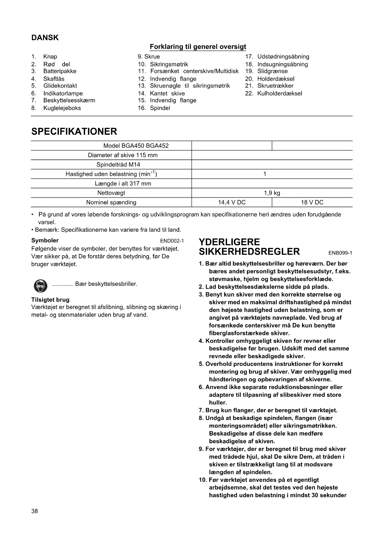 - Bemærk: Specifikationerne kan variere fra land til land. Symboler END002-1 Følgende viser de symboler, der benyttes for værktøjet. Vær sikker på, at De forstår deres betydning, før De bruger værktøjet. ............. Bær beskyttelsesbriller. Tilsigtet brug Værktøjet er beregnet til afslibning, slibning og skæring i metal- og stenmaterialer uden brug af vand. YDERLIGERE SIKKERHEDSREGLER ENB099-1
