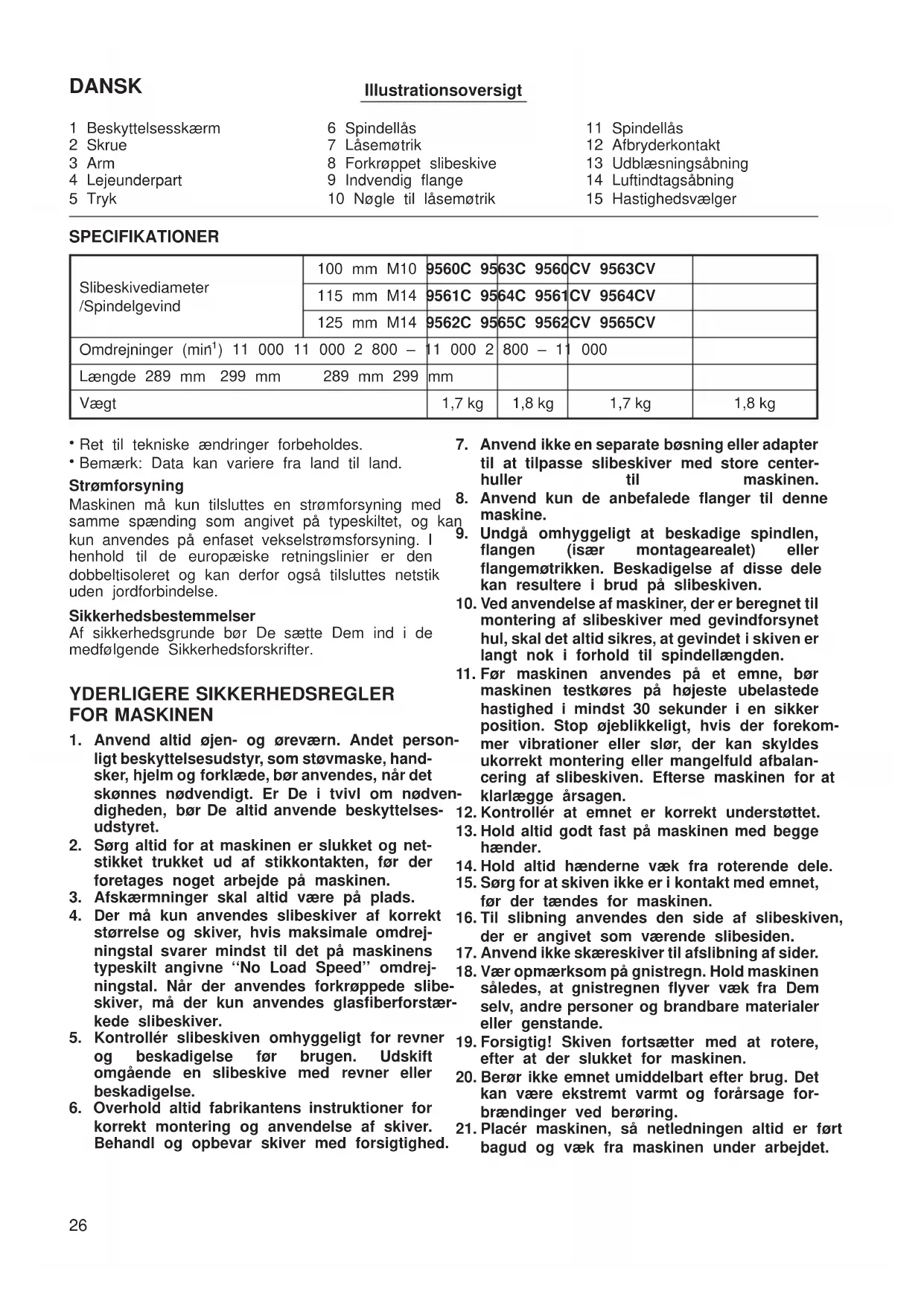 ublokerede, når der arbejdes under støvede forhold. Hvis det skulle blive nødvendigt at fjerne støv, skal De først tage maskinens net- ledning ud af stikkontakten, og dernæst ren- gøre maskinen (med anvendelse af ikke- metalliske genstande), idet der udvises forsigtighed, så indvendige dele ikke bliver beskadigede. GEM DISSE FORSKRIFTER. ANVENDELSE Montering af beskyttelsskærm (Fig. 1 og 2) Vigtig: Kontrollér altid, at maskinen er slået fra og at netstik- ket er taget ud, før De monterer eller afmonterer beskyttelsesskærmen. Træk armen i pilens retning efter at have løsnet skruen. Montér beskyttelsesskærmen på lejeunderparten ved at rette den konvekse del af beskyttelsesskærmen ind efter den konkave del af lejeunderparten. Drej beskyttelsesskærmen 180 grader. Fastgør den med skruen efter at have trukket armen i pilens retning. Beskyttelsesskærmens fastgørelsesvinkel kan justeres med armen, så vinklen passer til arbej- dets art. Afmontering af beskyttelsesskærm. Følg monteringsproceduren i omvendt rækkefølge for at afmontere beskyttelsesskærmen. Montering af sidegrebet (hjælpegreb) (Fig. 3) Vigtigt: Kontrollér altid, at maskinen er slået fra og at netstik- ket er taget ud, før De monterer eller afmonterer sidegrebet. Sidegrebet bør altid fastgøres på maskinen før arbej- det påbegyndes. Sidegrebet kan installeres på begge sider af maskinen, alt efter hvilken position, der er bedst egnet og holder beskyttelsesskærmen i den rigtige stilling. Hold altid maskinen med en hånd på afbrydergrebet og den anden på sidegrebet under arbejdet. Spindlelås (Fig. 4) Tryk på spindlelåsen for at forhindre at spindlen drejer med, når der monteres eller afmonteres tilbehør. FORSIGTIG: Aktiver aldrig spindlelåsen, mens spindlen er i bevæ- gelse. Maskinen kan blive beskadiget. Montering og afmontering af slibeskiven (Fig. 5 og 6) Vigtigt: Kontrollér altid, at maskinen er slået fra, og netlednin- gen taget ud af stikkontakten, før De monterer eller afmonterer slibeskiven. Montér den indvendige flange på spindlen. Anbring slibeskiven over den indvendige flange, og skru flangemøtrikken på spindlen. Ved fastgøring af flangemøtrikken trykkes hårdt på spindelstopknappen, således at spindlen ikke kan dreje. Skru derefter flangemøtrikken fast med nøglen ved at dreje i retning med uret. Ved afmontering af slibeskiven gennemføres oven- nævnte fremgangsmåde i omvendt rækkefølge. Afbryderkontaktbetjening (Fig. 7) FORSIGTIG: Før maskinen sættes til netstillet, skal De altid kon- trollere, at afbryderkontakten fungerer korrekt og returnerer til ‘‘OFF’’ positionen, når siden på afbryder- kontakten trykkes ned. Start maskinen ved at skyde afbryderkontakten til ‘‘I’’ position. Ved vedvarende arbejde trykkes den forreste del af afbryderkontakten ned, hvorefter kontakten skydes til ‘‘I’’ position som ovenfor. Afbryderkontakten er låst i positionen for vedvarende arbejde. For at stoppe maskinen fra denne låste position skydes afbryderkontakten til ‘‘O’’ position, mens den bagerste del af afbryderkontakten holdes trykket ind. Hastighedsvælger (for model 9560CV, 9561CV, 9562CV, 9563CV, 9564CV, 9565CV) (Fig. 8) Rotationshastigheden kan ændres ved at dreje hastighedsvælgeren til en given talindstilling fra 1 til 5. Højere hastighed opnås, når vælgeren drejes i retning af 5. Langsommere hastighed opnås, når vælgeren drejes i retning af 1. Se nedenstående tabel for forholdet mellem talindstil- lingerne på vælgeren og den omtrentlige rotationsha- stighed. Tal min