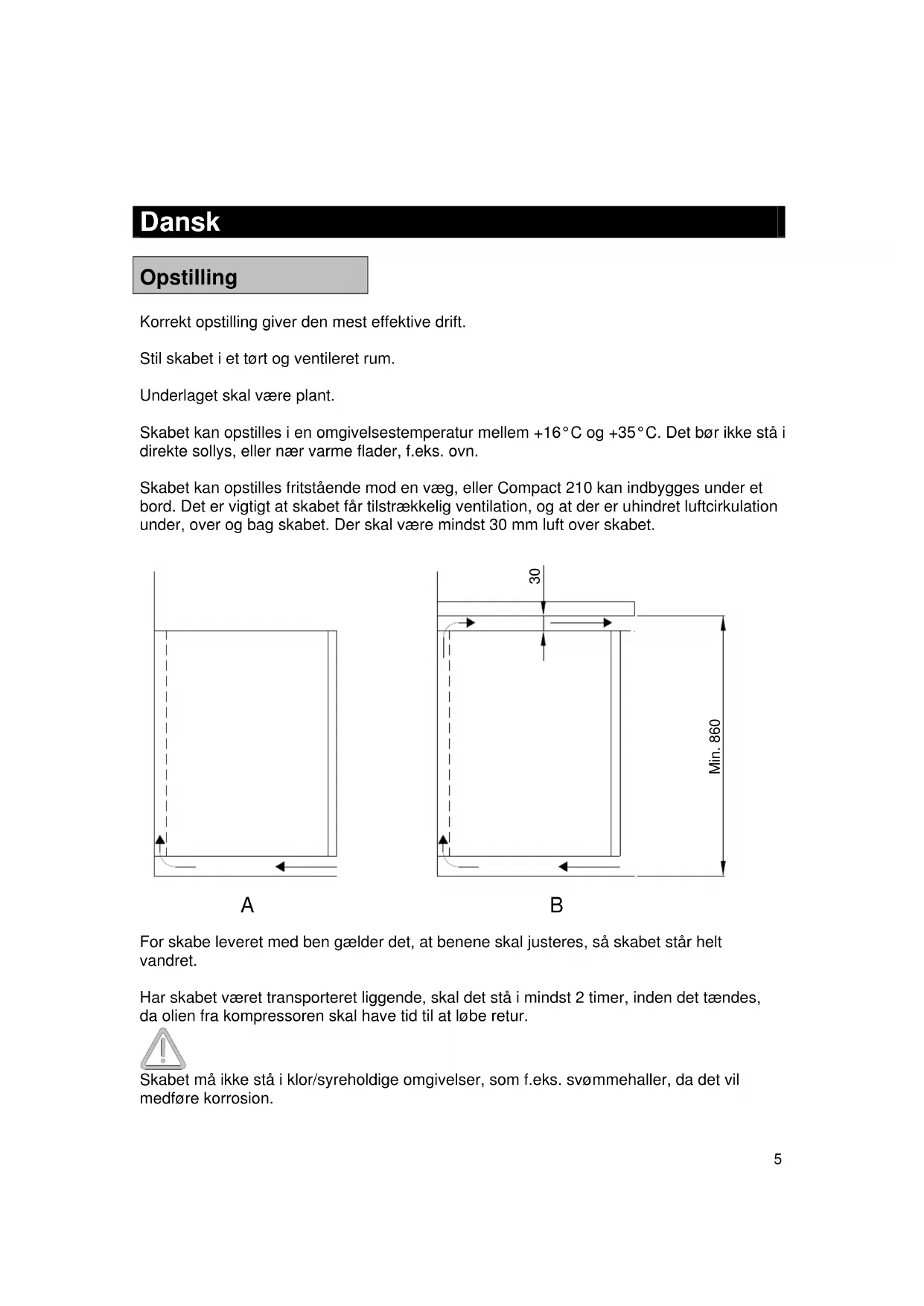 Opstilling Korrekt opstilling giver den mest effektive drift. Stil skabet i et tørt og ventileret rum. Underlaget skal være plant. Skabet kan opstilles i en omgivelsestemperatur mellem +16°C og +35°C. Det bør ikke stå i direkte sollys, eller nær varme flader, f.eks. ovn. Skabet kan opstilles fritstående mod en væg, eller Compact 210 kan indbygges under et bord. Det er vigtigt at skabet får tilstrækkelig ventilation, og at der er uhindret luftcirkulation under, over og bag skabet. Der skal være mindst 30 mm luft over skabet. Min. 860