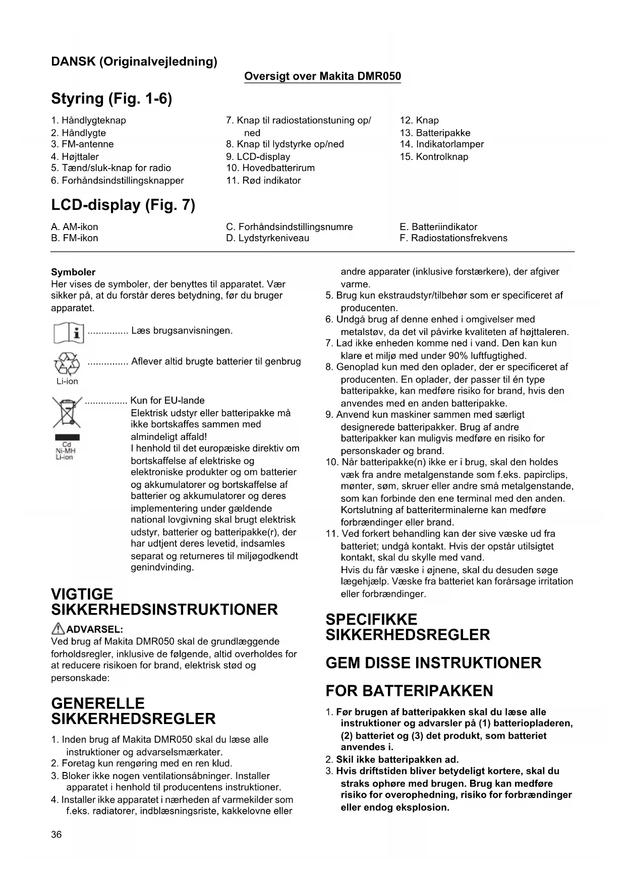 horas Aprox. 12 horas Dimensões (com bateria BL1430) 263 mm x 75 mm x 196 mm Peso líquido 0,95 kg (com bateria BL1415/ BL1415N) 1,14 kg (com bateria BL1430/ BL1430B/ BL1440/ BL1450/BL1460B) 0,99 kg (com bateria BL1815/ BL1815N/ BL1820/ BL1820B) 1,23 kg (com bateria BL1830/BL1830B/BL1840/BL1840B/ BL1850/BL1850B) 1,29 kg (com bateria BL1860B)36 DANSK (Originalvejledning) Oversigt over Makita DMR050 Styring (Fig. 1-6) LCD-display (Fig. 7) Symboler Her vises de symboler, der benyttes til apparatet. Vær sikker på, at du forstår deres betydning, før du bruger apparatet. ............... Læs brugsanvisningen. ............... Aflever altid brugte batterier til genbrug ................ Kun for EU-lande Elektrisk udstyr eller batteripakke må ikke bortskaffes sammen med almindeligt affald! I henhold til det europæiske direktiv om bortskaffelse af elektriske og elektroniske produkter og om batterier og akkumulatorer og bortskaffelse af batterier og akkumulatorer og deres implementering under gældende national lovgivning skal brugt elektrisk udstyr, batterier og batteripakke(r), der har udtjent deres levetid, indsamles separat og returneres til miljøgodkendt genindvinding. VIGTIGE SIKKERHEDSINSTRUKTIONER ADVARSEL: Ved brug af Makita DMR050 skal de grundlæggende forholdsregler, inklusive de følgende, altid overholdes for at reducere risikoen for brand, elektrisk stød og personskade: GENERELLE SIKKERHEDSREGLER