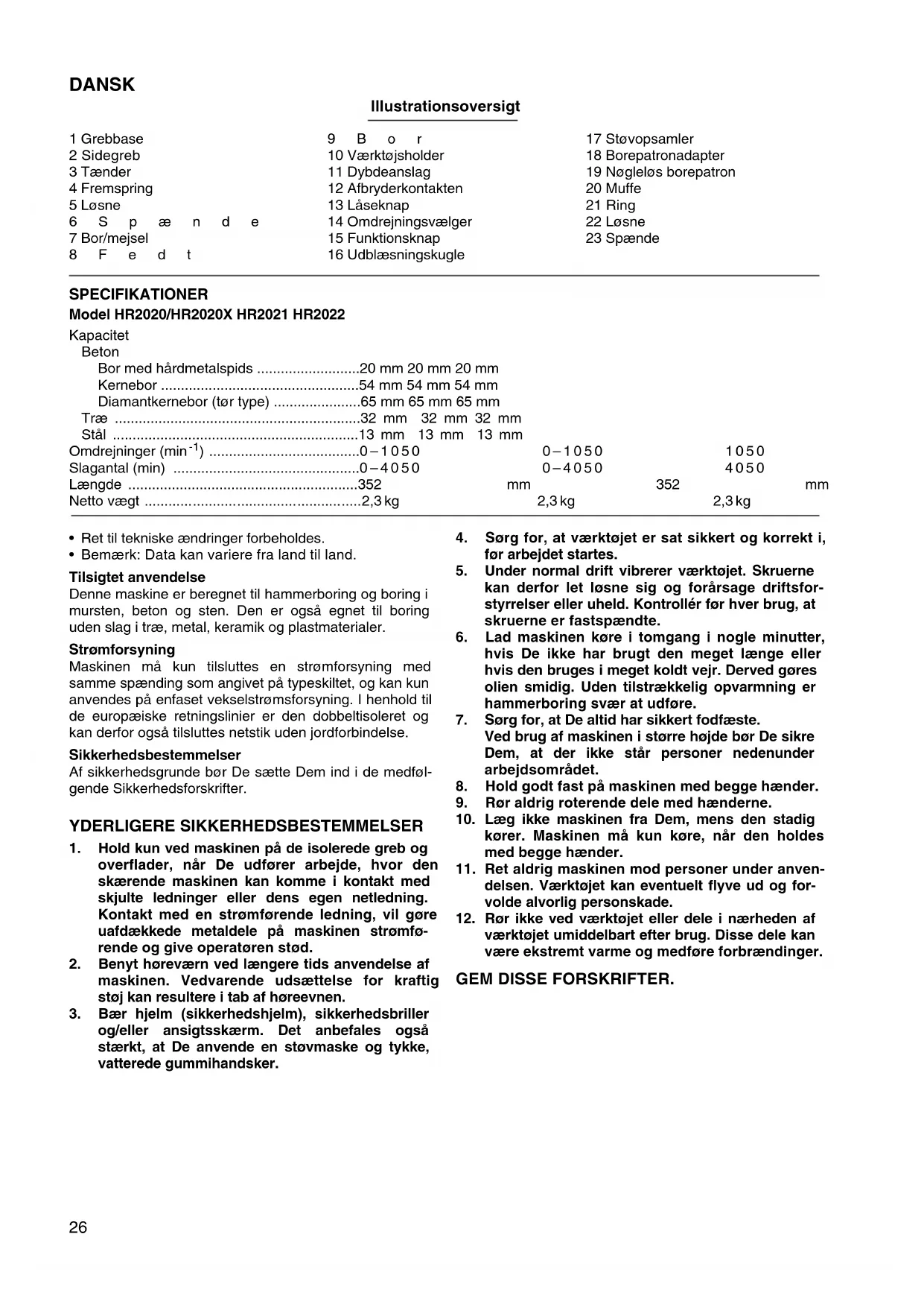 - Anvend ikke værktøjet til store hulsave. Disse har ten- dens til at sætte sig fast. Dette vil medføre, at skridkob- lingen for ofte slår til. Hammerboring Placer boret på det ønskede sted, hvor hullet skal bores, og tryk derefter på afbryderen. Anvend ikke magt. Med et let tryk opnås de bedste resul- tater. Hold boret mod hullet og sørg for, at det ikke rut- scher væk. Tryk ikke yderligere såfremt borehullet bliver tilstoppet af spåner eller støv. Lad istedet værktøjet køre i tomgang, og træk dernæst boret delvist ud af hullet. Ved at gen- tage dette adskillige gange bliver borehullet rent, og boringen kan genoptages. FORSIGTIG: Værdtøjet/boret udsættes for en kolossal og pludselig drejning når hullet gennembrydes, når borehullet stoppes af støv eller sten, eller når det slår mod de forstærkende bjælker i betonen. Brug altid sidegrebet (hjælpegreb) og hold væktøjet godt fast både med sidegrebet og afbry- dergrebet under anvendelse. Hvis dette ikke gøres, kan det medføre at De mister kontrollen over værktøjet og dermed alvorlige skader.28 Smøring Smør halsen på boret med en smule smørelse(ca. 0,5 – 1,0 g) før anvendelse. Denne smøring sikrer problemfri funktion og forlænger værktøjets levetid. Udblæsningskugle (Fig. 9) Anvend udblæsningskuglen til at blæse hullet rent. Støvopsamler (Fig. 10) Anvend støvopsamleren for at forhindre støv i at drysse ned over værktøjet og Dem selv når der foretages borin- ger i større højder. Sæt støvopsamleren på boret som vist i Fig. 10. Støvsamleren kan sættes på værktøj af føl- gende størrelse. Boring i træ eller metal (Fig. 11 og 12) Brug borepatronsættet (ekstraudstyr) (standard udstyr for Model HR2020X). Se “Montering og afmontering af boret”, beskrevet på foregående side, når borepatron- sættet skal monteres. Hold på ringen og drej muffen mod uret for at åbne kæberne. Sæt værktøjet helt ind i værktøjsholderen. Hold fast på ringen, og drej muffen med uret for at stramme borepatronen til. For at afmontere værktøjet skal De holde på ringen og dreje muffen mod uret. Indstil funktionsknappen til “kun rotation”. Den maksimale borekapacitet i metal er 13 mm og i træ er den 32 mm. FORSIGTIG: